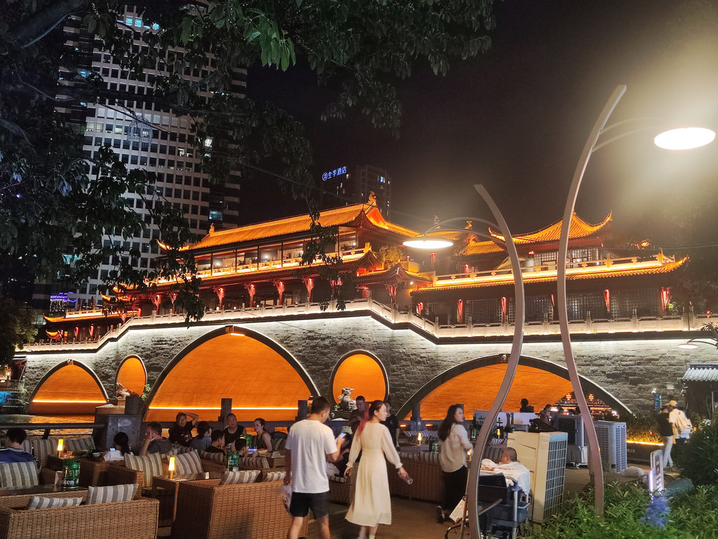 吃完火锅我们打车前往九眼桥,江边有酒吧一条街,也有夜景可观。抵达目的地,我们在江边漫步,特地去数数九眼桥的桥洞,发现怎么也数不出九个眼。后来查资料才知九眼桥始建于明朝,桥下确有九洞。1992年时旧桥有碍泄洪而被拆除,现在的新桥距离原桥1.9千米,2001年11月完工。关于九眼桥还有一个传说,当年张献忠败走四川,将金银珠宝藏在九眼桥一带,20世纪30年代曾从河底打捞出石牛和石鼓。九眼桥片区是“成都八大绝美夜景打卡地”之一,是成都夜场中的明珠。我们沿着江边的酒吧一条街向西走,天色渐暗,路边一侧是连片的一家家酒吧,五彩缤纷的霓虹灯亮起,里面的驻唱歌手已经开始演奏与歌唱,悠扬动听的歌声不绝于耳。九眼桥西边还有一座桥叫“安顺廊桥”,该桥也有悠久的历史,最初建筑可追溯到元代,在马可波罗的游记中,安顺廊桥是他印象中较为深刻的四座大桥之一。当然,现在这座桥也是重新设计建造的,2003才完工,有着明清风格。夜晚,桥上灯光亮起,屋顶和桥洞是金黄色的,桥身上的砖块是亮白的,屋檐下的柱子是红色的,远远望去,线条优美,璀璨夺目。在江边的小路上漫步,吹着江风,听着音乐,欣赏着夜景,好不惬意,结束了一天的游览。