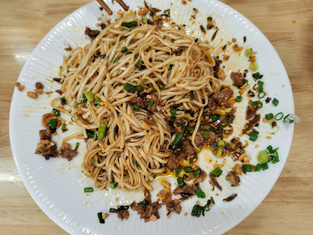 我们到达自在天民宿已经是中午了,这里的床特别大,是两张1.5米的,民宿建筑是仿古外形的,特别的是几幢楼是通过二楼的走廊连接互通的,多家民宿集中于此。老板娘给我们微信发了周边的好吃的餐馆,我们步行前往“草妹儿溢面馆”,点了剁椒牛肉面、清汤牛肉面、宜宾燃面、口蘑汤菜和叶儿粑,总计才52元,剁椒牛肉面尤为出色,是一种拌面,葱、蒜、辣椒、花椒、香油等调味料与细面条拌在一起,恰到好处。面条经过20多道工序精心制作,宛如一件精心雕琢的艺术品,臊子经过无数次反复炒制试味,秘制而成。口蘑汤菜是香菇和一种蔬菜加调味料一起煮的菜汤,清淡鲜香。店里墙上贴着店主夫妇创业开店的故事,2018年这家以女儿小名命名的面馆开业,受到了无数的追捧。拜水都江堰,寻味溢碗面,“溢碗面”已经成为都江堰的美食名片!