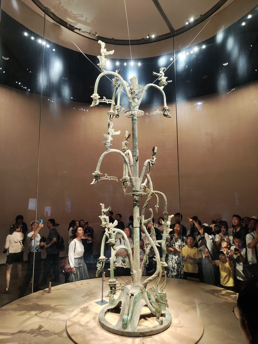 终于等到我们进入博物馆,我们跟着讲解员有重点地参观,听他详细讲解。四大镇馆之宝为商青铜神树、商青铜立人像、商金仗和商铜纵目面具,这四件文物集中展现了古蜀文明的神秘与高超工艺水平。其中青铜立人像有2.62米高,头戴高冠、身着龙纹礼袍,双手环握中空,赤足立于神兽底座,被认为是古蜀国集神权与王权于一身的统治者或大祭司;商金仗长1.43米,金皮包裹木杖,刻有戴冠巫师、鱼鸟箭纹图案,融合中原与西亚文化元素;压轴宝物是商青铜神树,高达3.96米,采用分段铸造技术,由底座、树身和龙形装饰组成,树分三层九枝,枝头立九鸟,树干盘踞飞龙,造型与《山海经》中“扶桑神树”高度吻合,象征古蜀人“天人合一”的宇宙观,是沟通天地的神树,也是全球现存最大的单件青铜文物。除了四大镇馆之宝,还有黄金面具、像方向盘的青铜太阳轮、像愤怒的小鸟游戏中形象的陶猪等等,“沉睡数千年,一醒惊天下!”三星堆博物馆展现了神秘莫测的祭祀文化、造型诡谲奇异的青铜器、精湛的黄金玉器工艺而震惊世界,一个半小时左右的参观讲解结束了,这是一次震撼人心的探秘之旅,讲解也花得很值。参观完主要展馆之后我们又参观了旁边的修复馆,里面有考古人员如何发掘和保护象牙的视频,文物的修复与保护也是一件非常有专业性的工作。