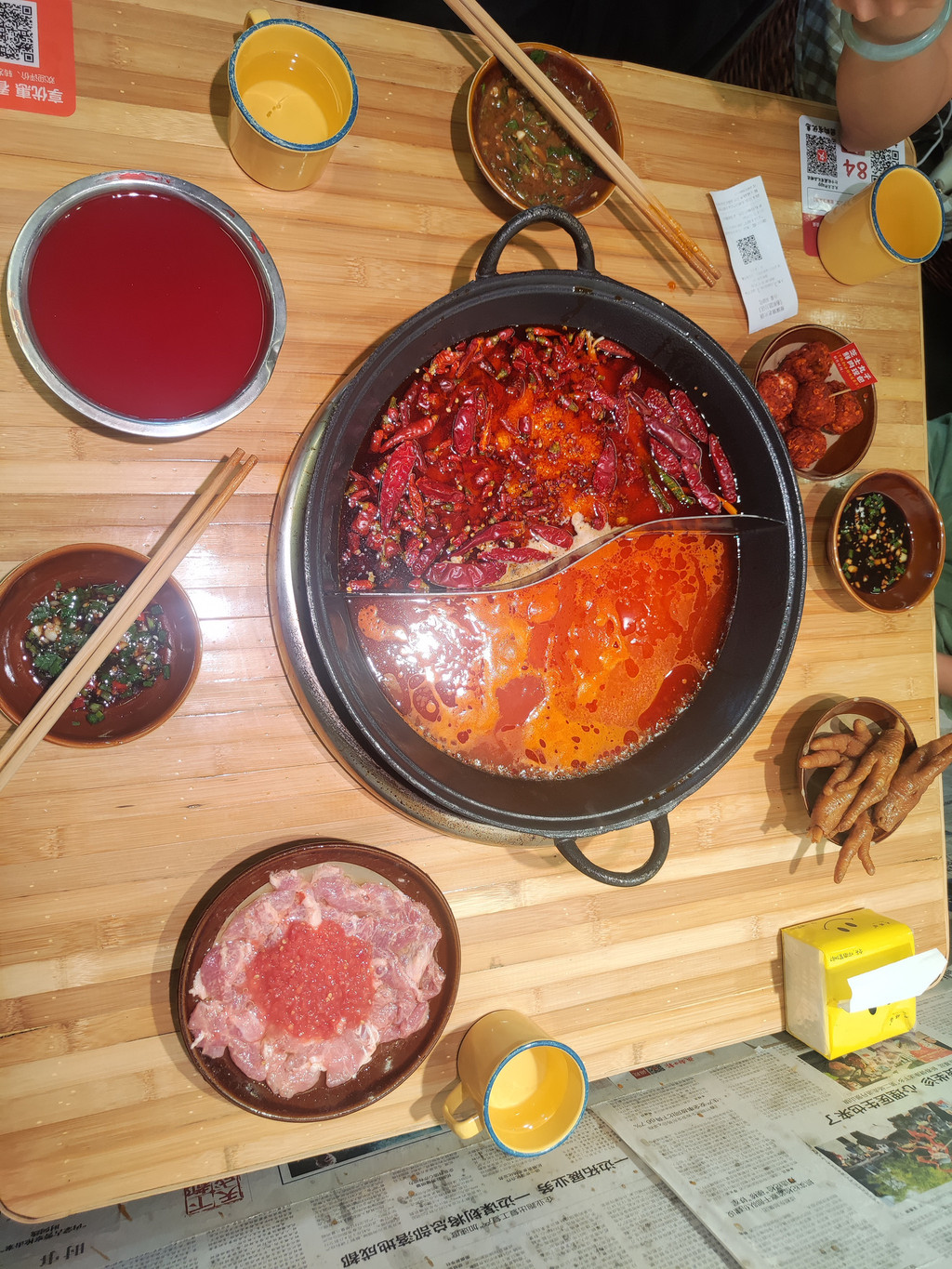 参观完三星堆后,我们坐公交回到春熙路,接下来步行去“翠嬢嬢老火锅”吃晚餐,这家店的名气也是非常大,它是开在一条小巷子里的,5点多到达已经要排队了。上到店里2楼,我们点了鸳鸯锅,手打番茄嫩肉片,芝士丸子鲜肉现包,鸡爪,鸭血,蛋炒饭,麻糍…店里墙上写了每种食材需要烫几分钟,还有料碟的经典标配是“蒜泥+香菜+香油”,“火锅料碟是灵魂!”,“多放香油,保护肠胃”,特地上网查了一下香油的作用,原来它富含不饱和脂肪酸和维生素E,有抗氧化、润肠通便、保护心血管的作用。吃完感觉总体满意,调味有特色,成都名火锅店很多,我们就尝了这一家,毕竟火锅总不能天天吃。