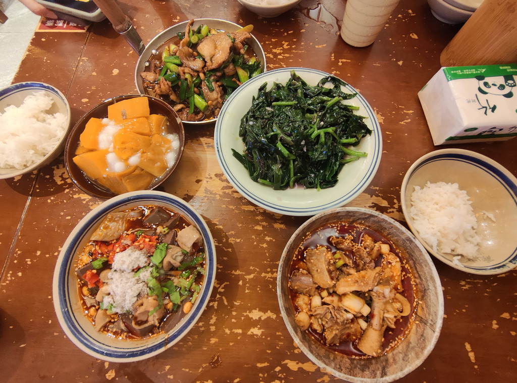 接下来我们走到民宿附近的咖啡馆小坐,之后去“抖小碗”吃完饭,虽然名字叫“小碗”,其实菜品的分量还是很足的,而且很便宜,南瓜丸子只要4.9元一碗,很甜,还点了鸭血肥肠、炒肉片等,米饭是送的,感觉满意。