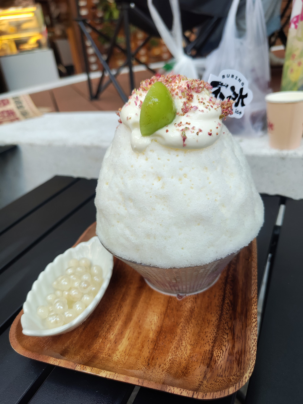 稍坐片刻,我们又起身去旁边的一个市场附近买了“剪刀土豆”、“玉米饼”等小吃,价格十分便宜,吃了非常饱腹,味道也不错。看到一家“王妈手撕烤兔”门口拍着长队,我们也去凑个热闹,买了一份烤兔。走累了,我们就又回到芳华街想顺便吃点冷饮、咖啡,先到了一家名为“不冰”的冷饮店,点了一份刨冰,感觉做工复杂,小料众多,口感层次丰富,绝对称得上顶级水平。