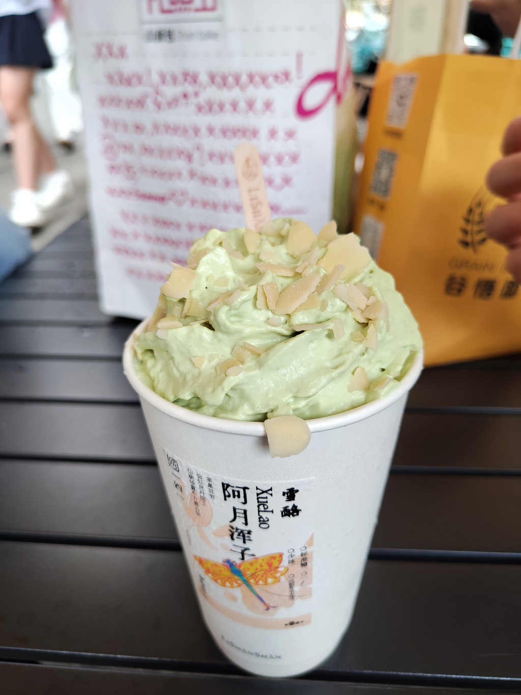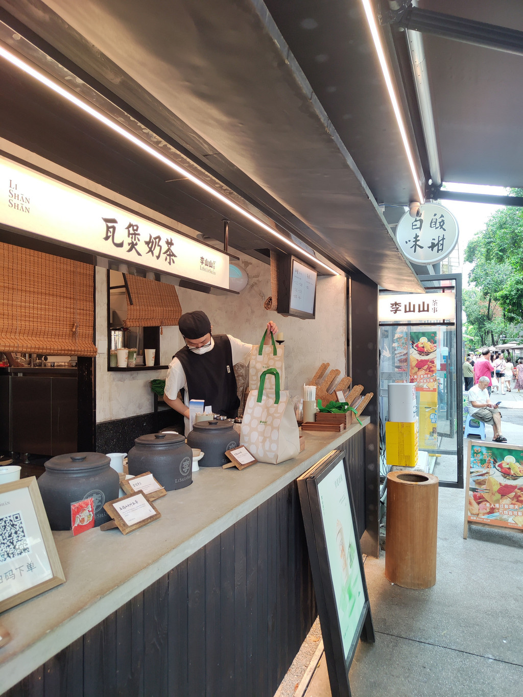 休息之后,我们决定最后半天再去逛逛芳草街、玉林路那边,因为13日晚上仅仅逛了一小部分。那天下午,我们在芳华街一带逛到了众多吸引人的咖啡店、冷饮店和面包店。我们先在“山面包”和“谷悟(grain inspiration)”分别买了面包,在“松哥凤爪”买了泡椒凤爪,在“李山山茶事”点了杯奶茶,坐在门口边喝奶茶边吃,“李山山茶事”是这边本土的奶茶店,产品起名很独特,我们点的是“阿月浑子”,绿茶底加上开心果奶油顶与杏仁片,一边嚼着入味的凤爪,咬上一口抹茶奶酪面包,一边又品着香醇的奶茶,瞬间消除了午饭未吃的饥饿感。