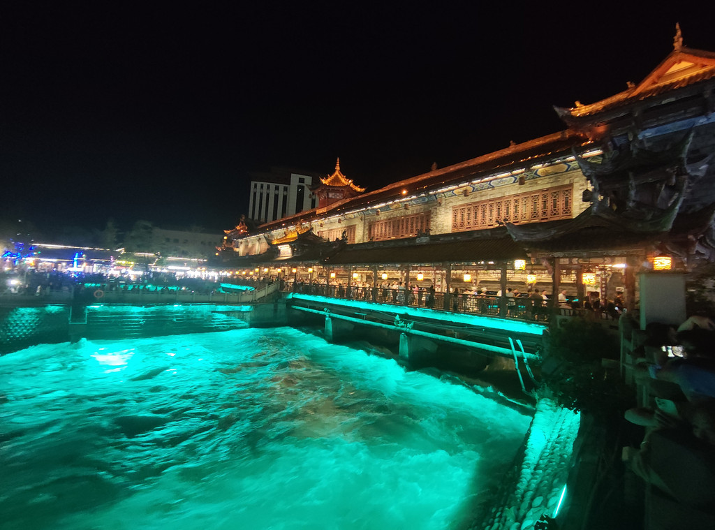 吃完后我们步行到江边看夜景,路过步行街,路边是各种卖小吃的摊,不时听到吆喝推销的,人山人海,热闹非凡,古人一定不会想到都江堰水利工程在千年之后成为了宝贵的旅游资源,给当地带来了巨大的人流和收入。我们挤到江边,可以看到岷江来水湍急,在灯光的共同作用下产生“蓝眼泪”的现象,这是水流中的气泡和矿物质增强了蓝光的折射和散射,形成宛如流动泪珠的梦幻场景。我们一边欣赏夜景,一边漫步回到酒店,结束了一天行程。