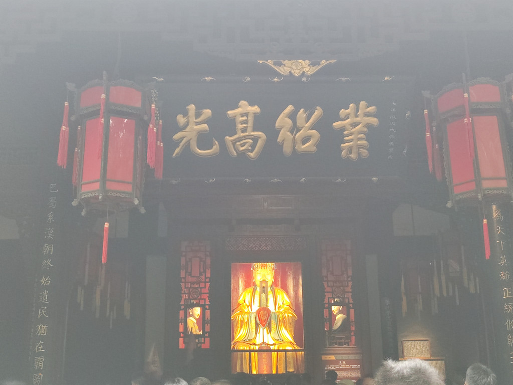 接下来是刘备殿,“业绍高光”的匾额寓意深远,“绍”是继承的意思,“高”指汉高祖刘邦,“光”指东汉第一个皇帝光武帝刘秀。匾额通过“绍”字表达了刘备继承刘邦和刘秀帝业的意愿,强调了蜀汉政权与两汉王朝的一脉相承,是对蜀汉正统地位的宣扬。匾额由清朝时期成都将军兼署四川总督完颜崇实亲自撰写。关羽殿的匾额为“义薄云天”,“义”为儒家倡导的“五常”美德之一,在我国漫长的历史中,关羽是公认的“义”的最高典范和楷模。张飞殿的匾额为“诚贯金石”,诚者,信也,为儒家倡导的“五常”美德之一。张飞的各种美德中,诚特别突出,是我国古代“诚”的楷模。