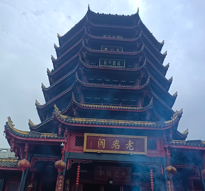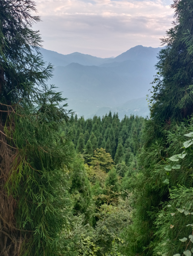 一路行至祖师殿,道长告知这里才是老道观。青城天下幽,是日人多日晒只见山林不见幽,至此继续走就比较陡峭了,路窄且陡,人多时需要排队等待通行,直到古龙跨栈道及其下的掷笔槽,方有幽幽青山之趣意,大约13:00到了老君阁。