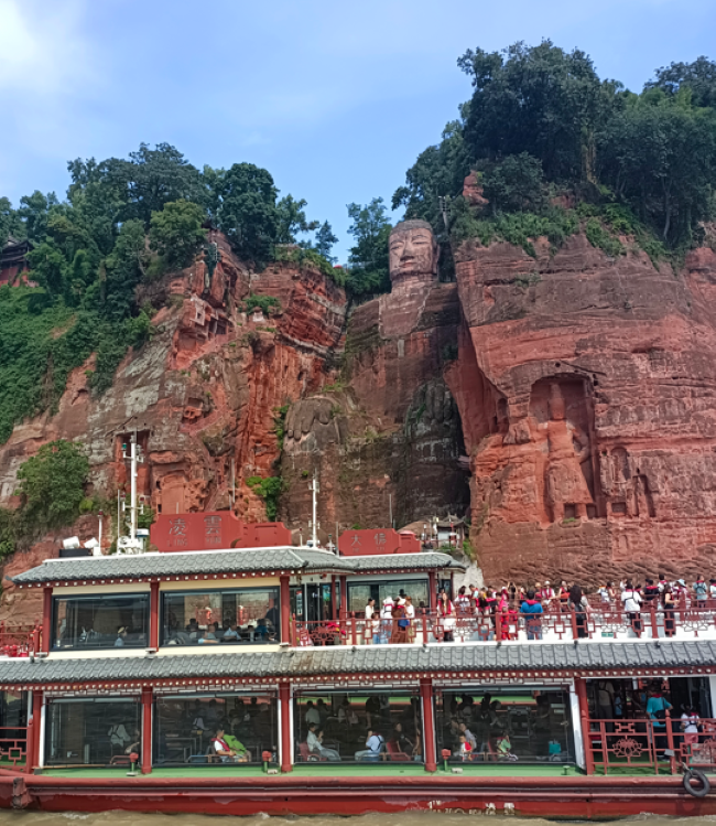 大约12点走到五显岗车站团餐,然后下了峨眉去乐山,睡了一觉就到了。在导游劝说下,全部团友都选择了船游大佛。下车很热,排队有遮阴但风扇不多,大约45-50分钟后上船看大佛。
