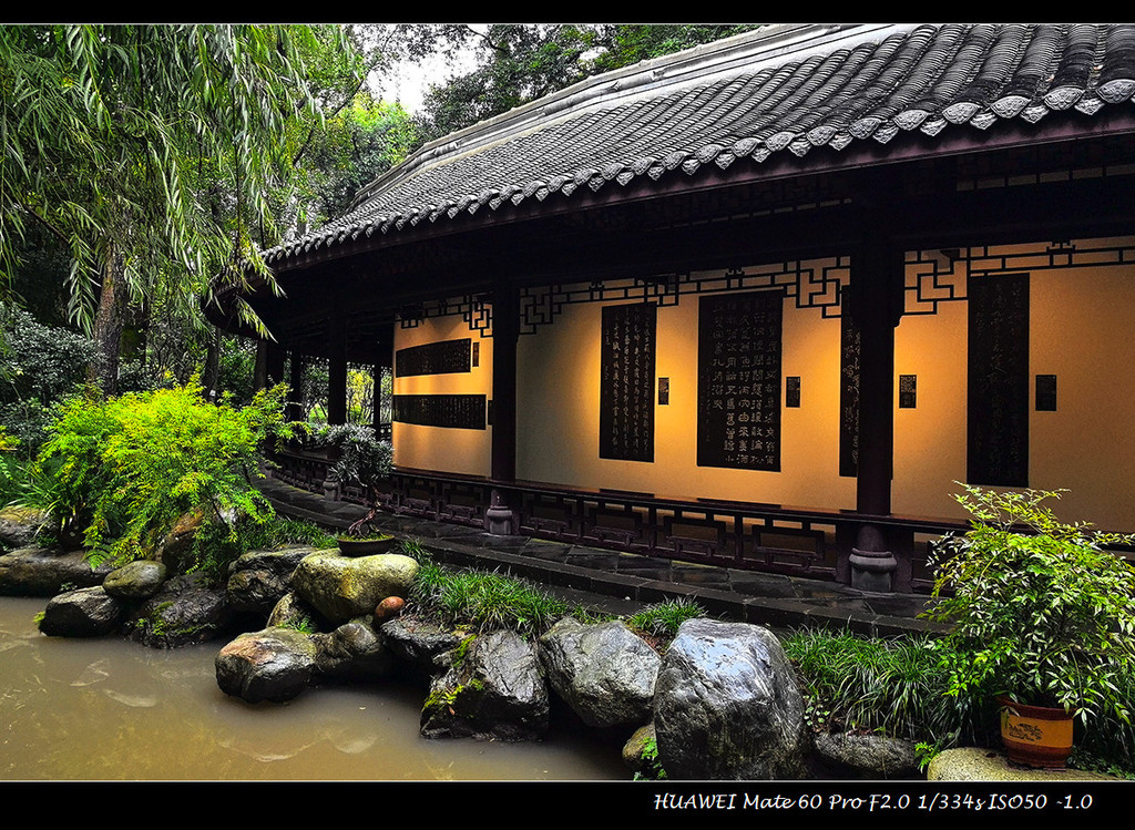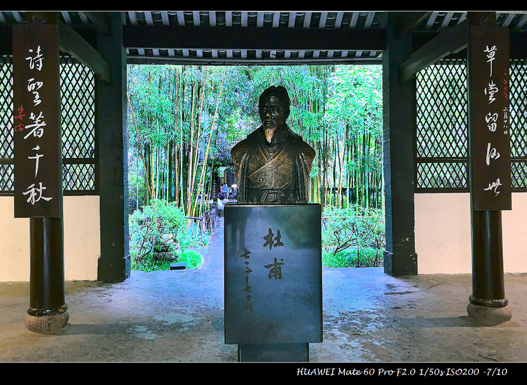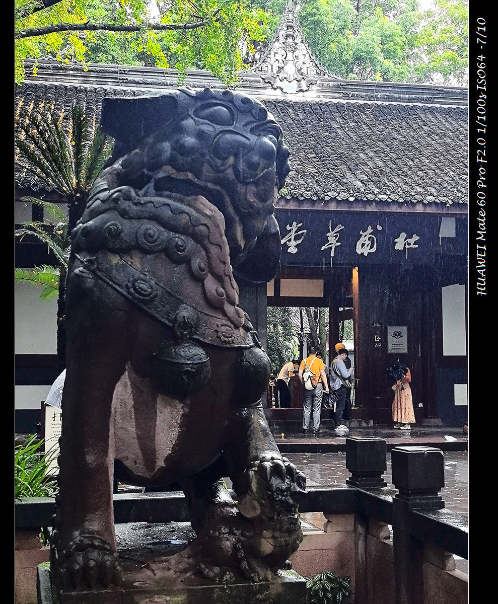 暑期后国庆前的工作日,相对是旅游淡季,但武侯祠的游客依然络绎不绝,杜甫草堂则冷清了很多。赶上成都入秋的大雨和降温,杜甫草堂显得格外清幽,正应了杜甫诗中“床头屋漏无干处,雨脚如麻未断绝”的境遇,更能体会他那“安得广厦千万间,大庇天下寒士俱欢颜,……吾庐独破受冻死亦足”的悲悯之心,杜甫游历广泛,杜甫草堂只是他晚年寓居四年多的地方,却成了纪念杜甫最出名的地方。他死于湘江边,所以长沙有个杜甫江阁,我路过多次,并不以为意,但在杜甫草堂,这几间茅屋仿佛代表了杜甫的一生。当然杜甫草堂经过历代纪念和翻建,早就不止几间茅屋,现在景区内有工部祠、李杜堂、大雅堂、诗史堂、草堂影壁、千诗碑、唐遗址等古迹和陈列,完整记录呈现了杜甫的诗词情怀和后世名家的赞颂推崇。