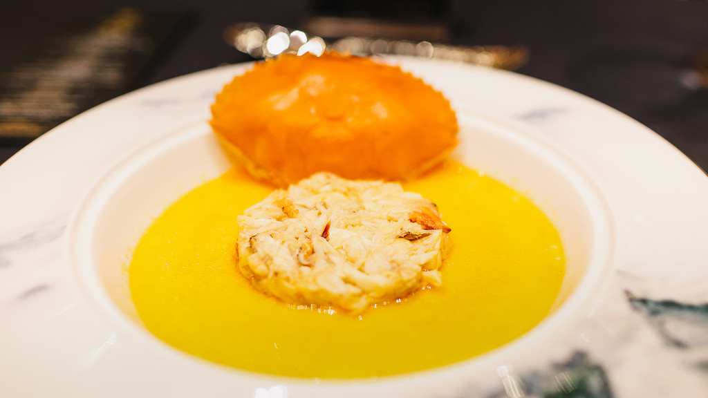 严选斯里兰卡青蟹,先以低温冰镇封存海产本鲜,再经慢蒸激发蟹肉醇香。手拆蟹肉后搭配当日鲜剥虾肉慢熬成汤,注入细腻蛋液二次蒸制,让鲜韵深度交融。每份由一整只青蟹制成,专属一位宾客。蟹肉丰腴、虾肉脆嫩,鲜甜绵长。