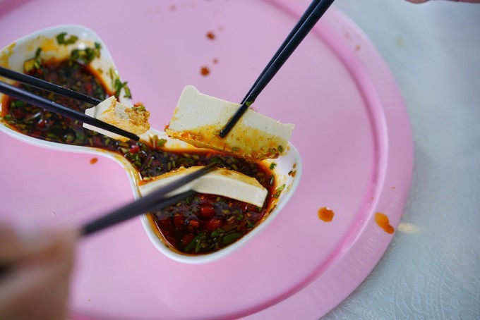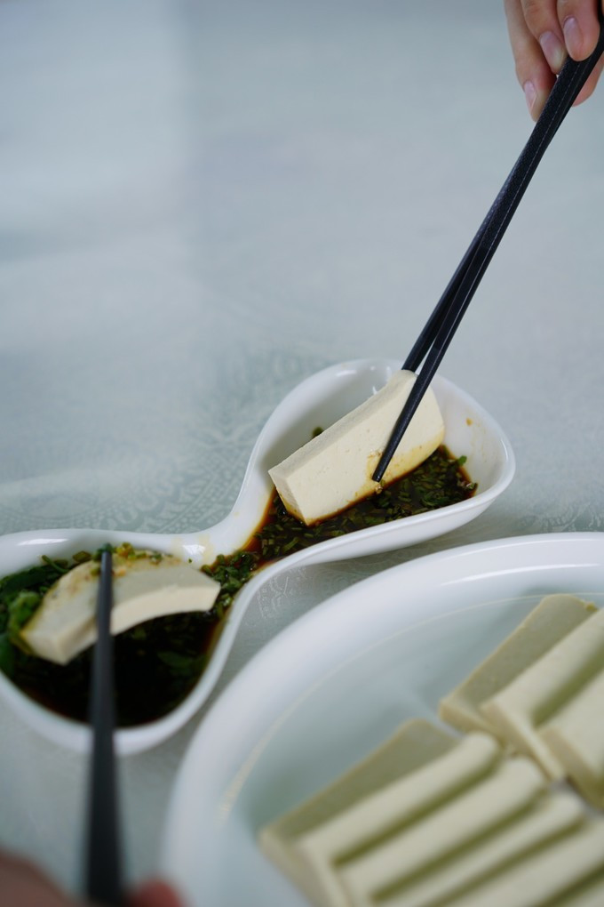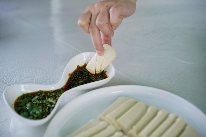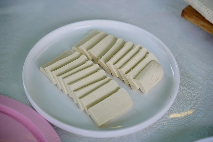 新鲜做的豆腐只需要简单切片,醮上酱汁,辣椒,就能成为一道美味。你吃过一定会爱上它。