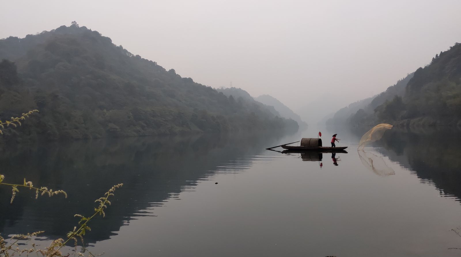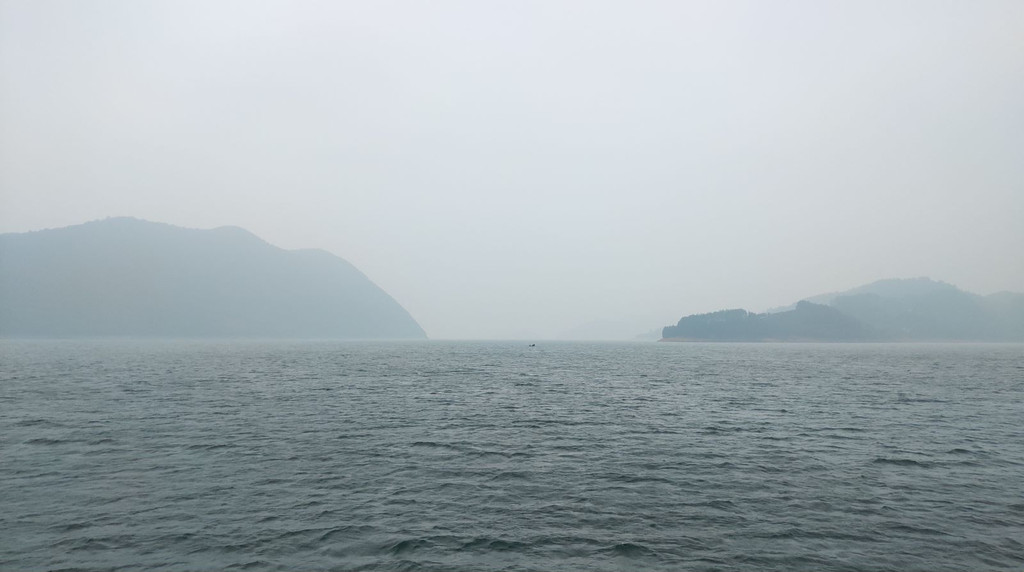 9:20检票,9:30多出发,前往兜率灵洞,半路上会放慢船速给机会上二楼甲板欣赏风景、拍照,没必要专门去买二楼VIP包间的,除非出行人数多;因为天气的原因,远山像在雾中若隐若现的,尤其是与地平线平齐的地方,湖中央还有一艘小小船的哦;