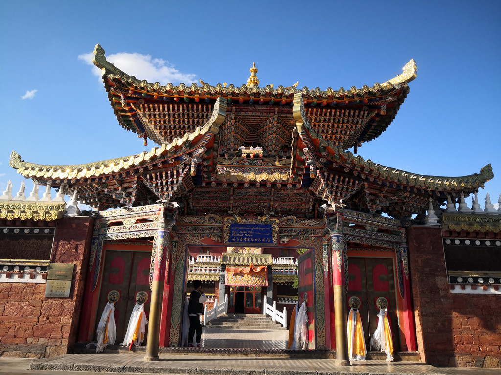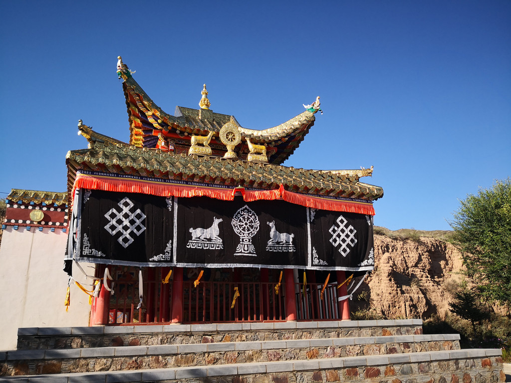 白崖石景区有个白崖寺,往寺庙里走的时候,正好主殿顶上有个喇嘛正在吹长号,号声悠长而神秘,像牵动着我双脚的无形绳索,想拍照又不敢太明显,远远的摁下快门,大家看见屋顶上的喇嘛了吗?
