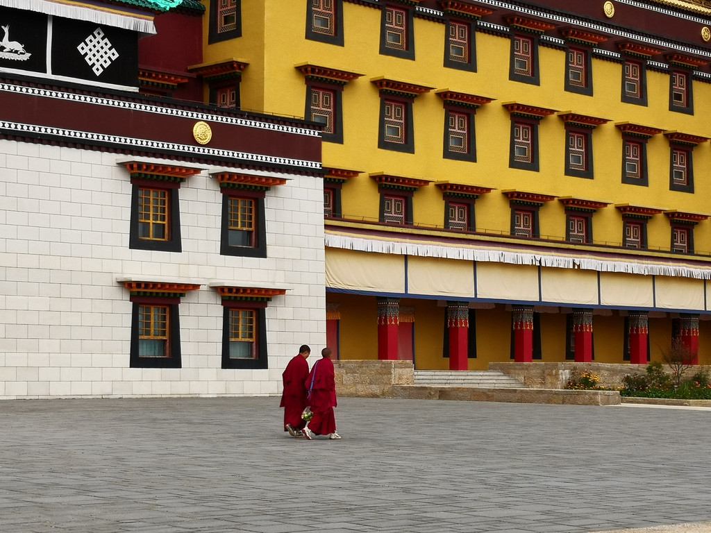 讲经快开始了,僧人们往回跑