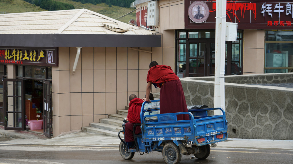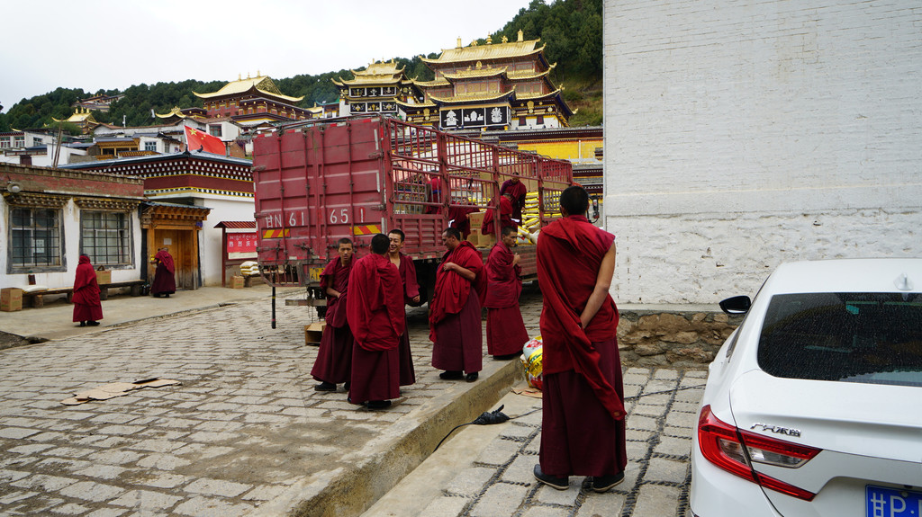 上午去了郎木寺,这天寺庙喇嘛正好分派米和油,扛在肩上推着小车,好不热闹。