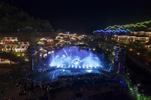 而另一边,葛仙村度假区为夜游打造的大型实景光影秀堪称惊艳,玉清台、洗尘门、清幽涧、缘生池、太虚幻境等19个观赏点遍布仙村,月光、灯光与水系、建筑交相辉映,流光溢彩,极具视觉美感。