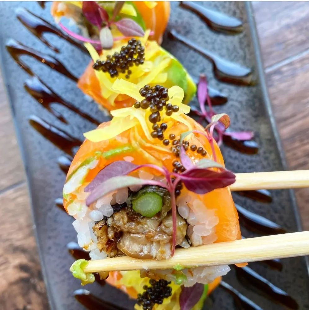 这是小编超级爱的一款寿司!看着照片是不是就觉得很 富裕 的样子。这是由三文鱼、鲑鱼、牛油果、鱼籽组成的!配着秘制酱汁一口下去,全是满足~
