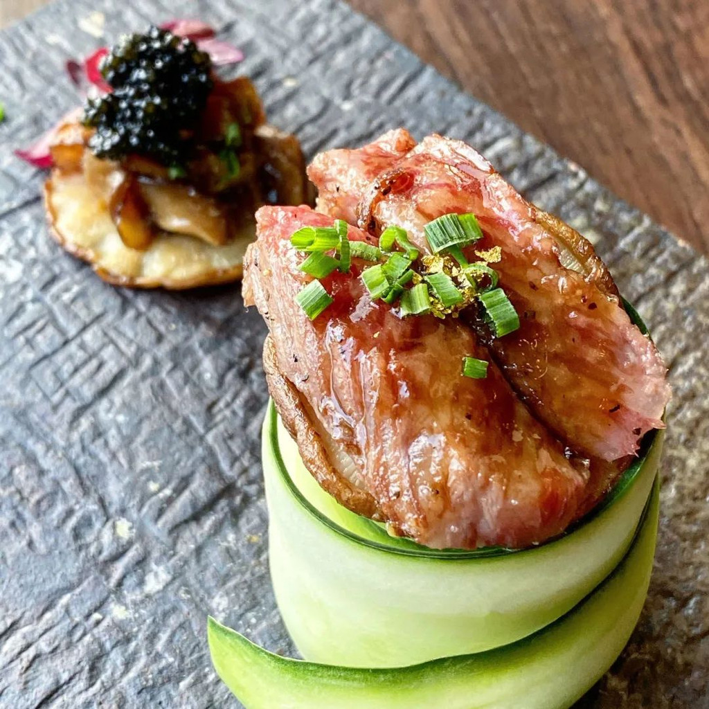 一大块和牛,就这么赤裸裸的躺在一片黄瓜上!被煎至5分熟~保留了食材原本的肉香!旁边还配有鱼籽,一口咬下去满嘴爆汁!