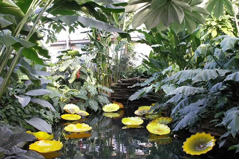 如果你是室内园丁,那你一定会在这里发现让你眼熟的植物,因为许多天南星科植物是非常受欢迎的室内植物。各种各样的类此类树木设计布置形成了山水画一样的格局。其中一个引人注目的特色是“波斯池”,它是由世界著名玻璃艺术家奇胡利(Chihuly)专门为Aroid House亲自设计,里面有16块黄色睡莲叶。