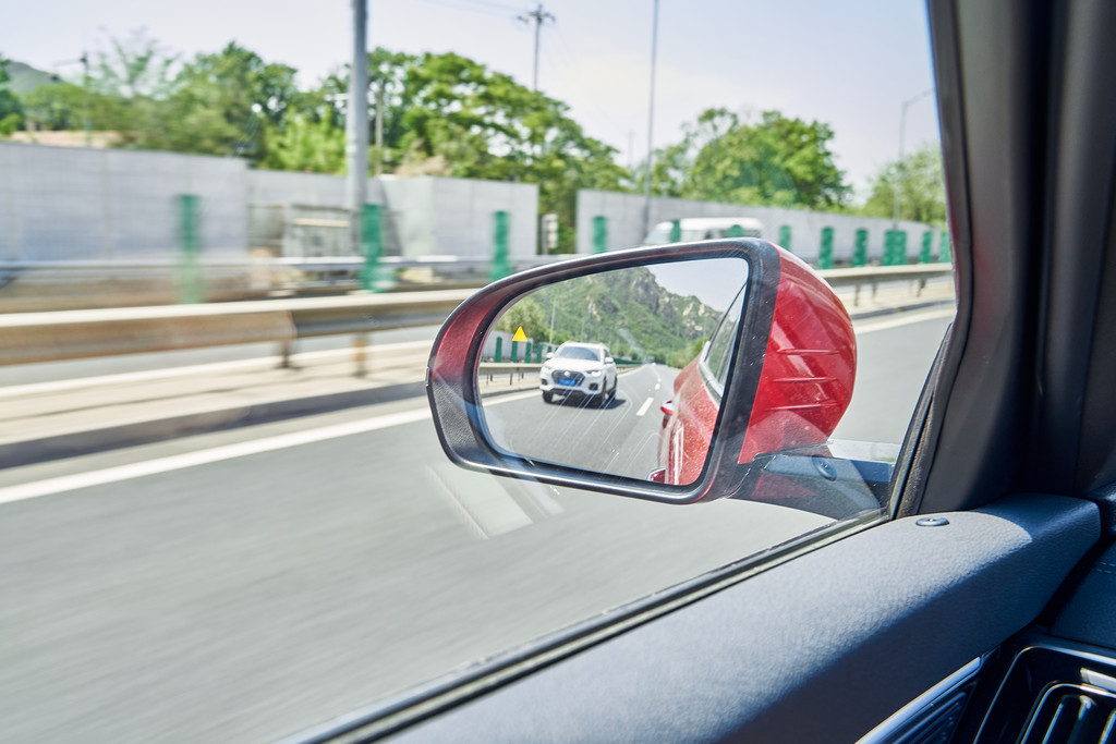 后视镜集成了盲区监测系统,随时监测侧后方来车,在超车并线时给予警示,以免发生剐蹭事故。