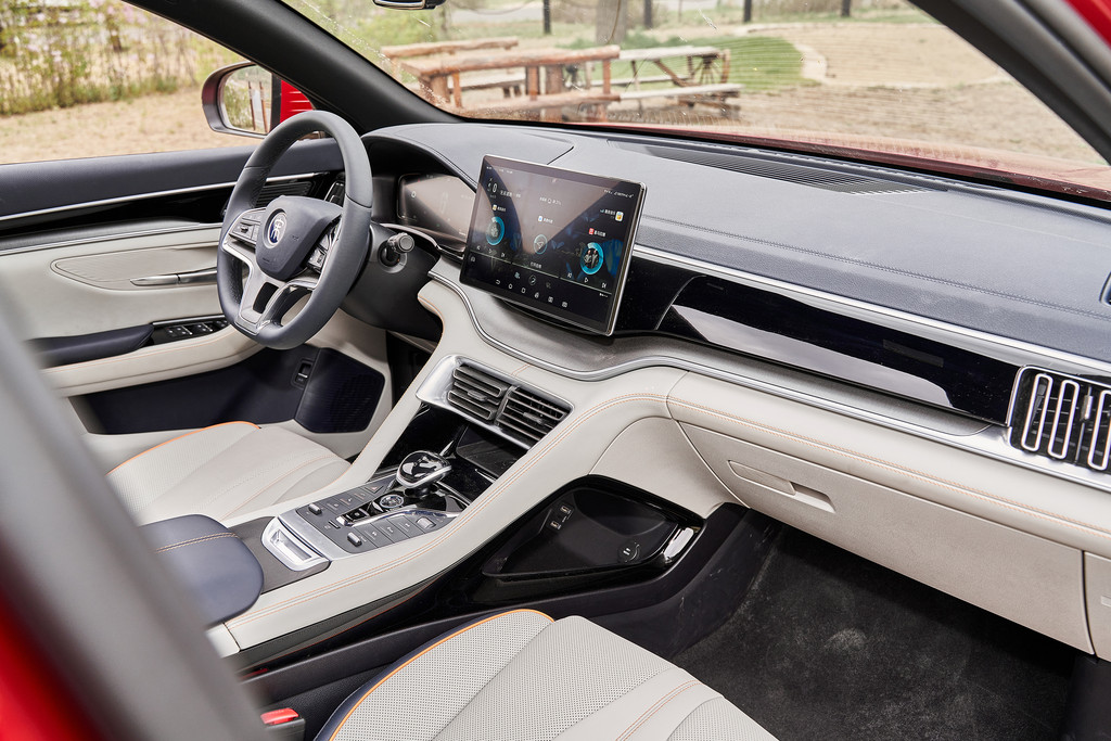 宋PLUS DM-i的12.8英寸悬浮Pad,可以竖向旋转,很有特色,可以根据自己的习惯使用横版还是竖版。内饰设计也尽显高端豪华,驾驶台通过不同材料工艺组合而成,钢琴漆的黑色面板下面层叠着哑光银色拉丝纹理的装饰板,由银灰色饰条勾边,整体感觉简洁又精致。
