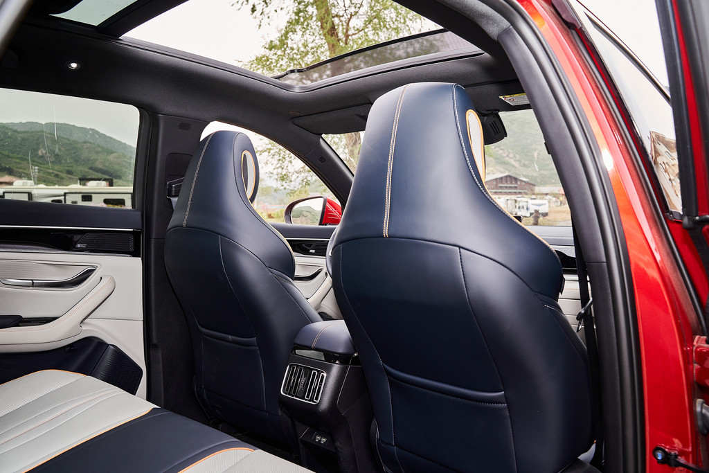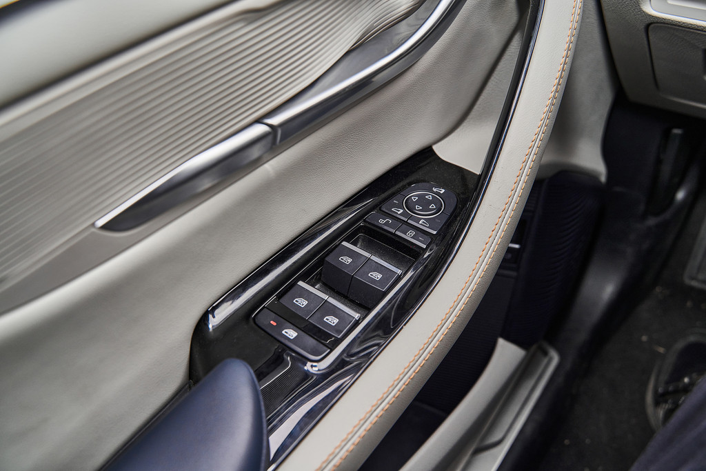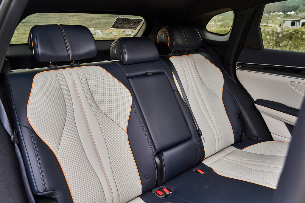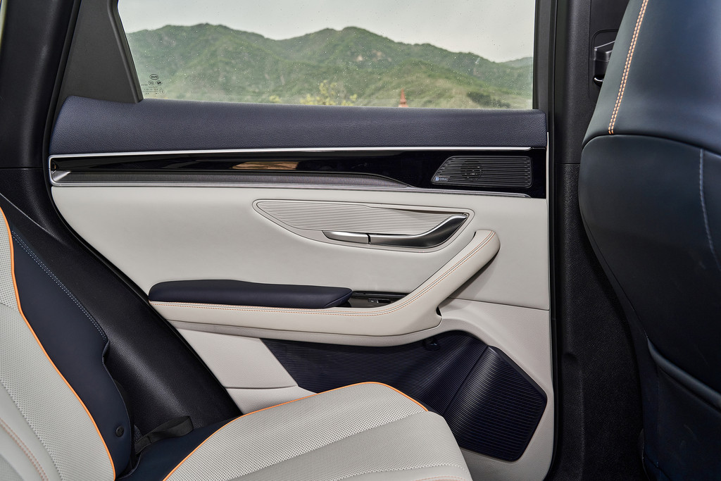 后排空间得益于1890mm的超长车宽和2765mm的跨级别轴距,令人惊喜的是,后排还可以调节角度,乘坐时那真是可以自如伸展了。后排车窗和后车窗均配备了隐私玻璃,非常人性化的,体贴的配置。后排门板也集成了Dirac音响喇叭,全车一共设置了9个音响喇叭,可以尽享立体环绕的音乐。