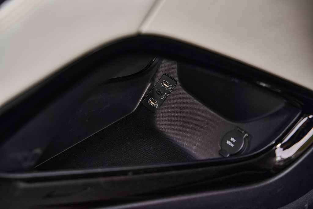 前排中央下部还有一个储物空间,内部还有两个USB充电接口和一个12V的电源接口。