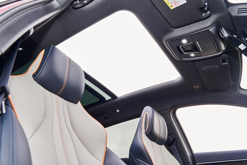 车顶区域有一个眼镜盒,触控式阅读灯和天窗的触控按钮,全景天窗的面积很大,在房车营地或者户外游玩,视野非常好,躺在车内可以欣赏优美的自然风光。