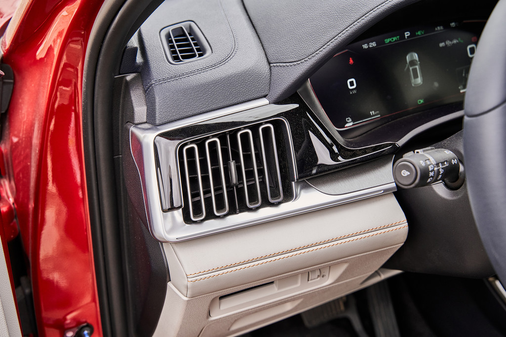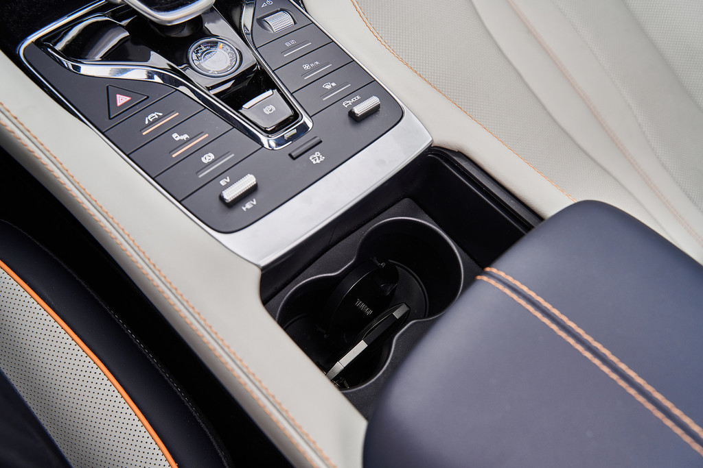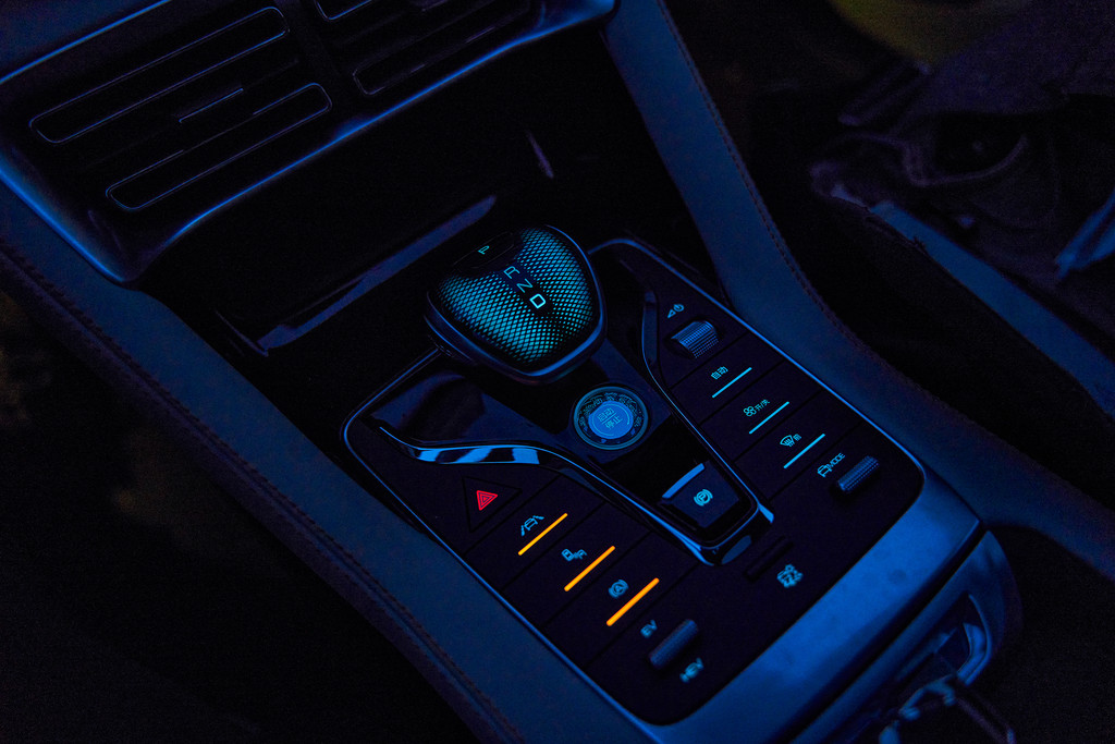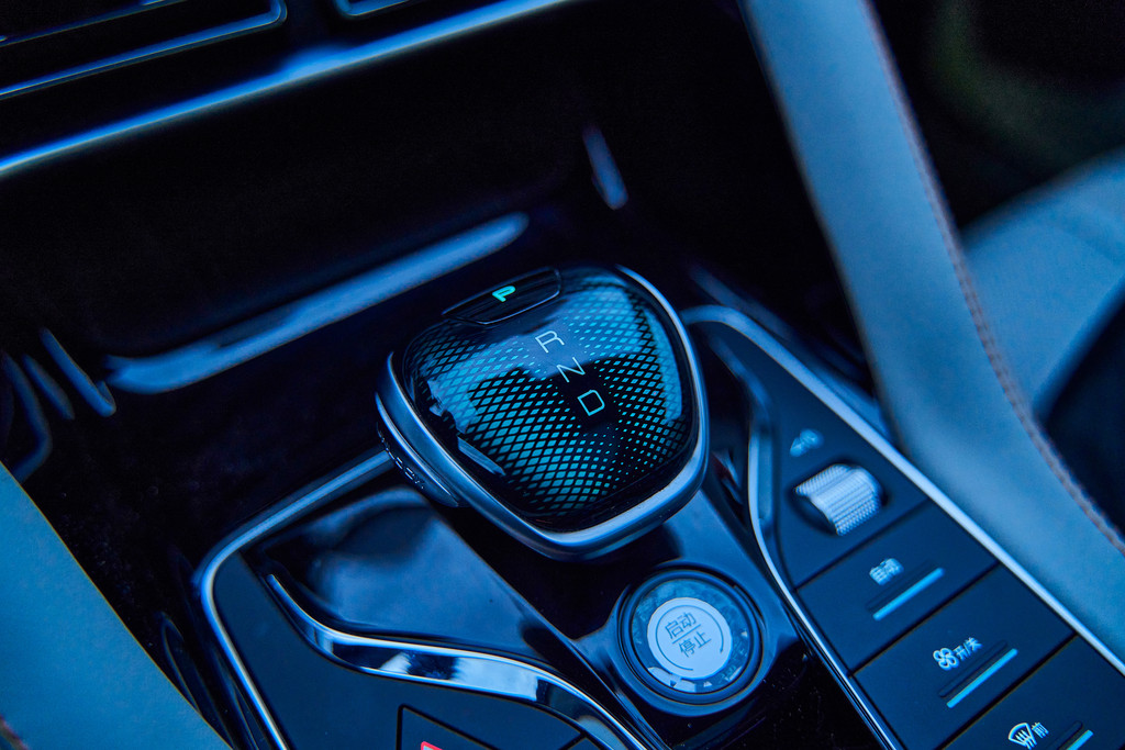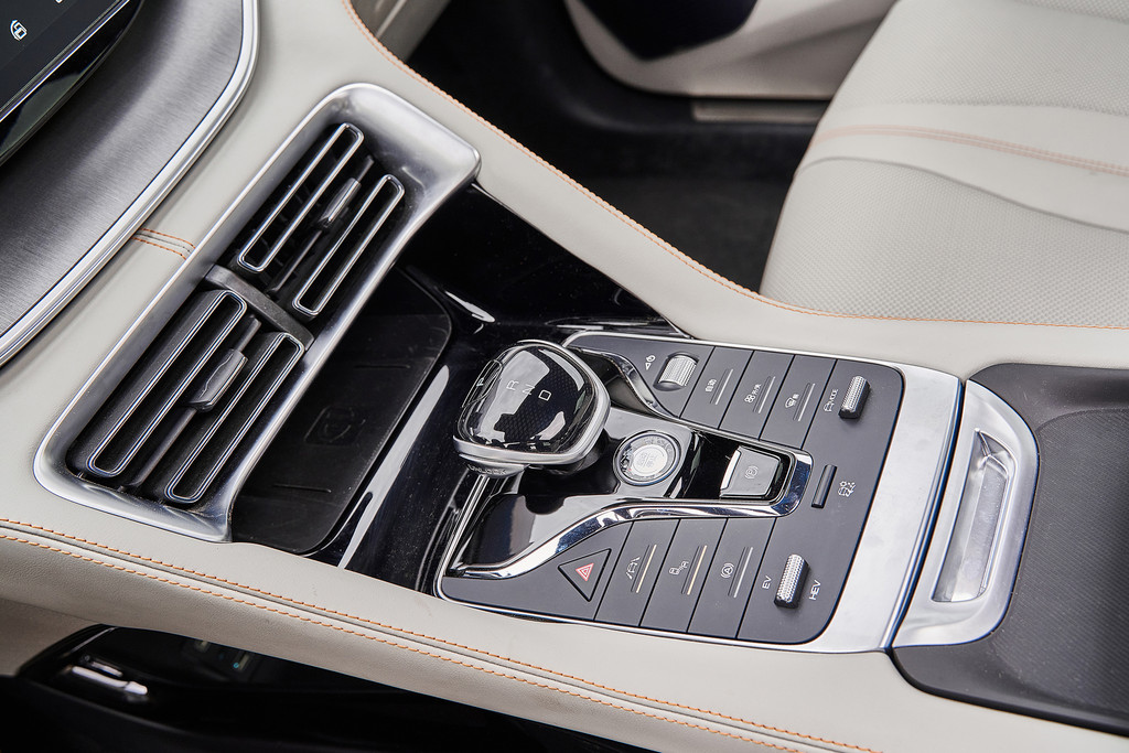 中央控制区域集成了很多功能按钮,首先是一键启动按钮设置在中间,下面是电子手刹按钮。右侧上方有一个可以调节音量的滚轮按钮,下面还设置了空调的物理按键。还有驾驶模式的切换拨杆。左侧呢,则是驾驶模式的控制,还有自动驻车的按钮,再往下是电动模式和混动模式的拨杆。当然手机无线充电功能是少不了的。能给的尽量都给。