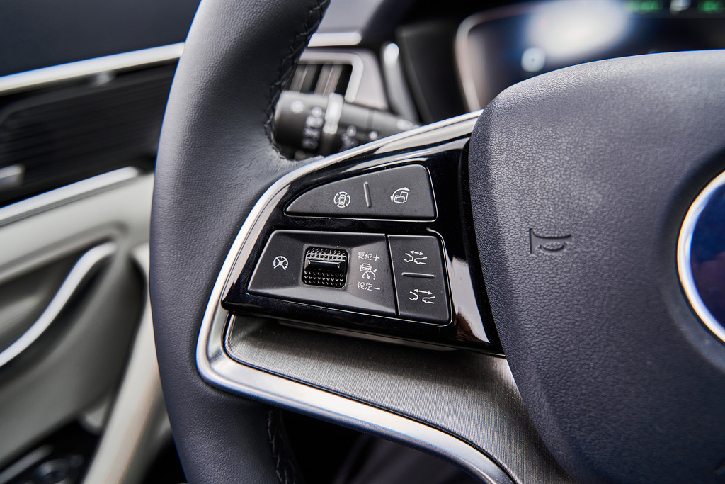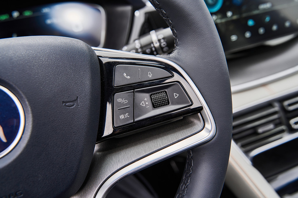 方向盘上的功能按钮和常规车型的功能基本一致,左侧是辅助驾驶模式的控制区域,还有中控屏的横竖旋转按钮,360全息透明影像系统。右侧是仪表的显示模式和蓝牙电话等等的功能。