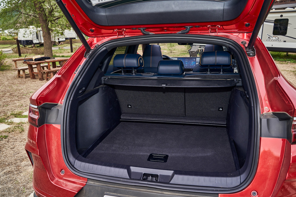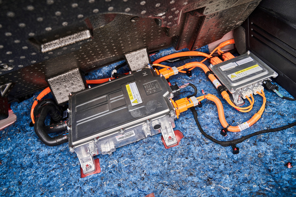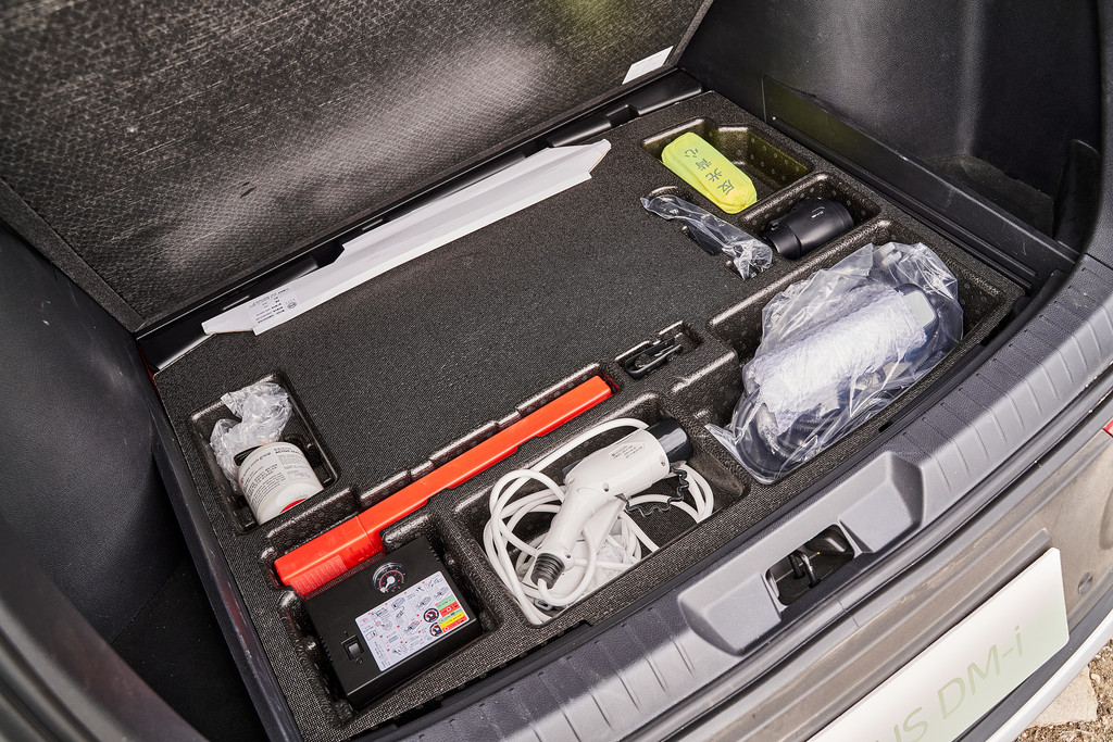 后备厢盖板下面放置了很多随车工具,充电线、补胎器等等设备,这里并没有放置备胎。