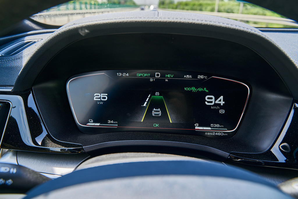 12.3英寸液晶仪表盘的显示模式非常简洁,中间是开启的辅助驾驶模式,左侧是电动数据,右侧是时速数据,下面左边长条图标是电量显示,右边是燃油里程显示。我试着切换其他显示模式,但是没有找到。