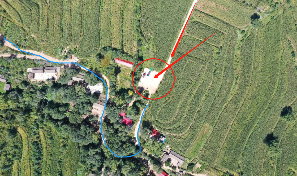 二道洼村俯瞰(红色为开车上山路线,蓝色为步行到山顶路线)