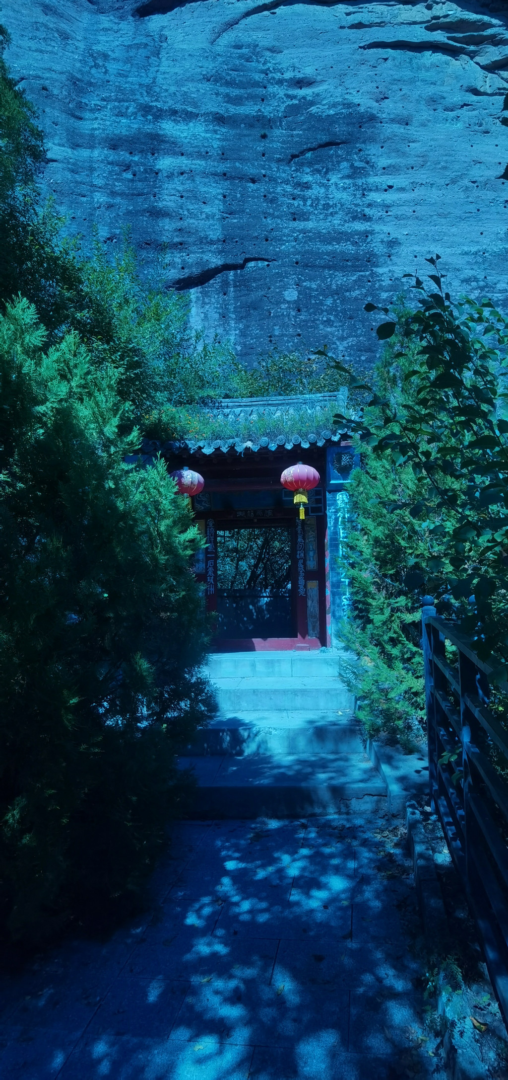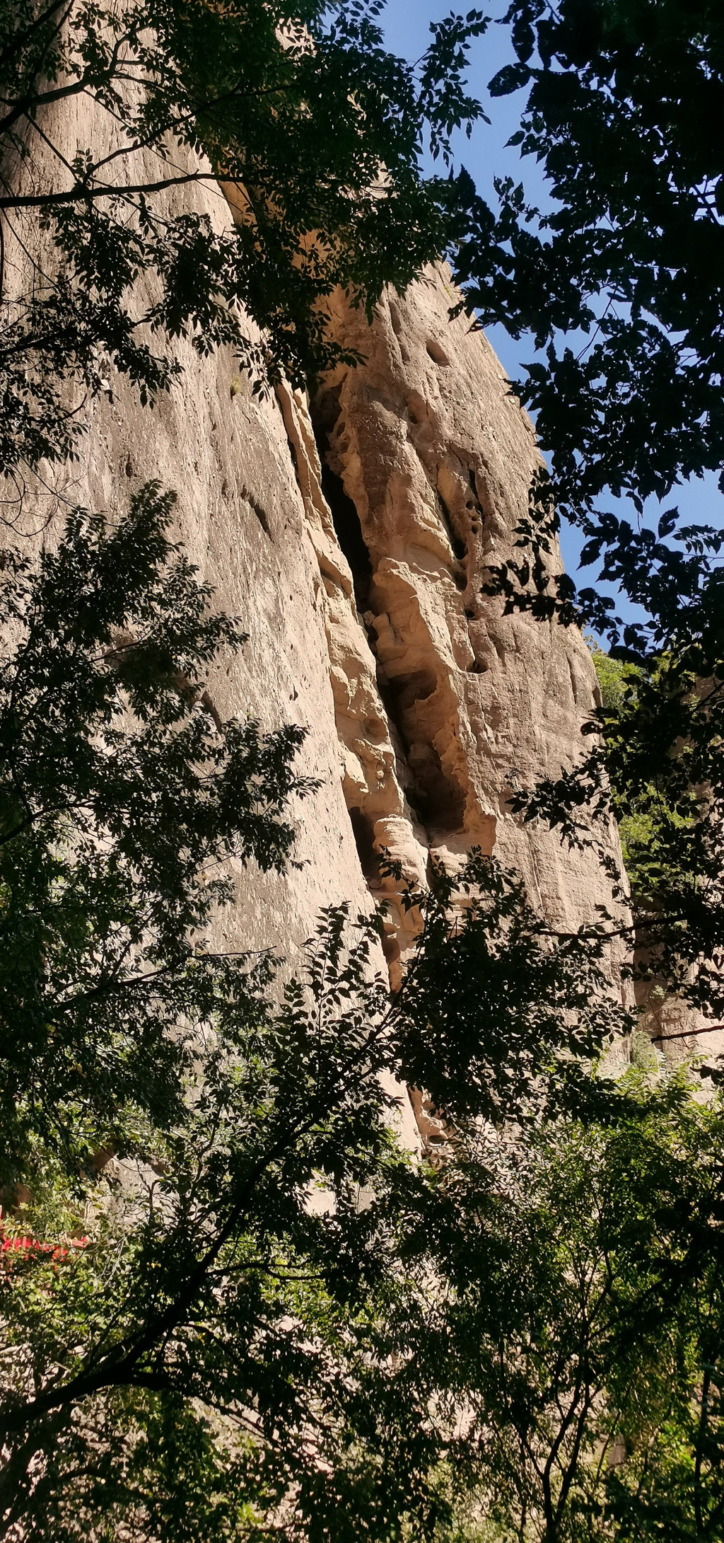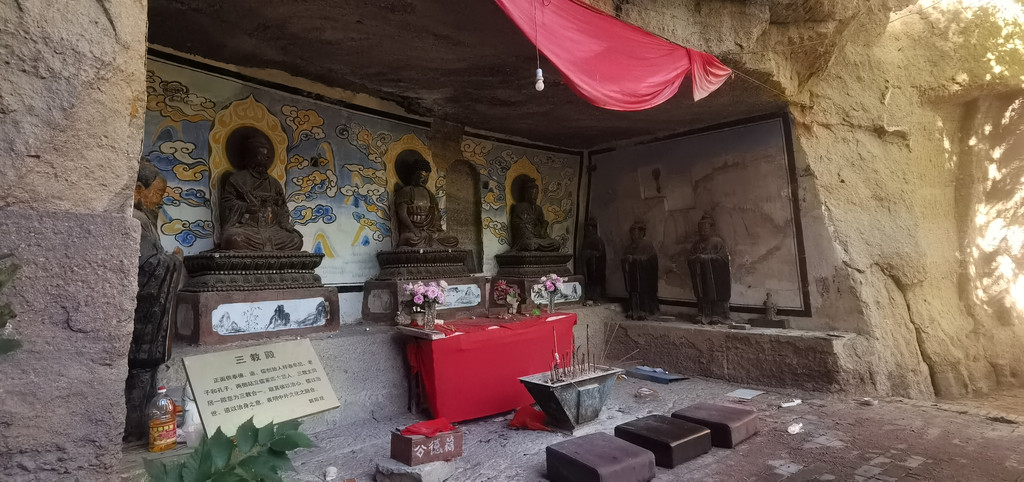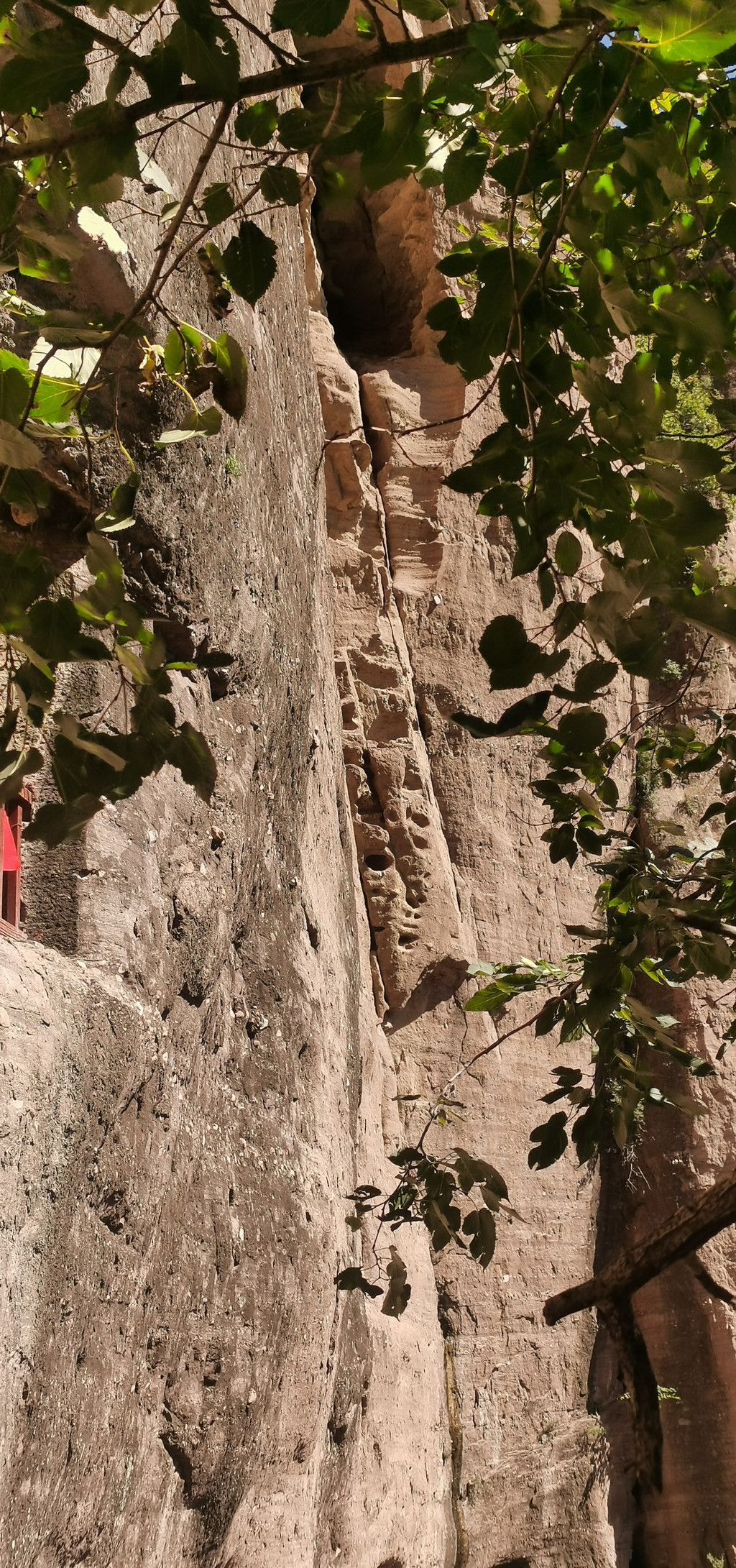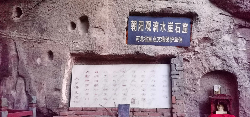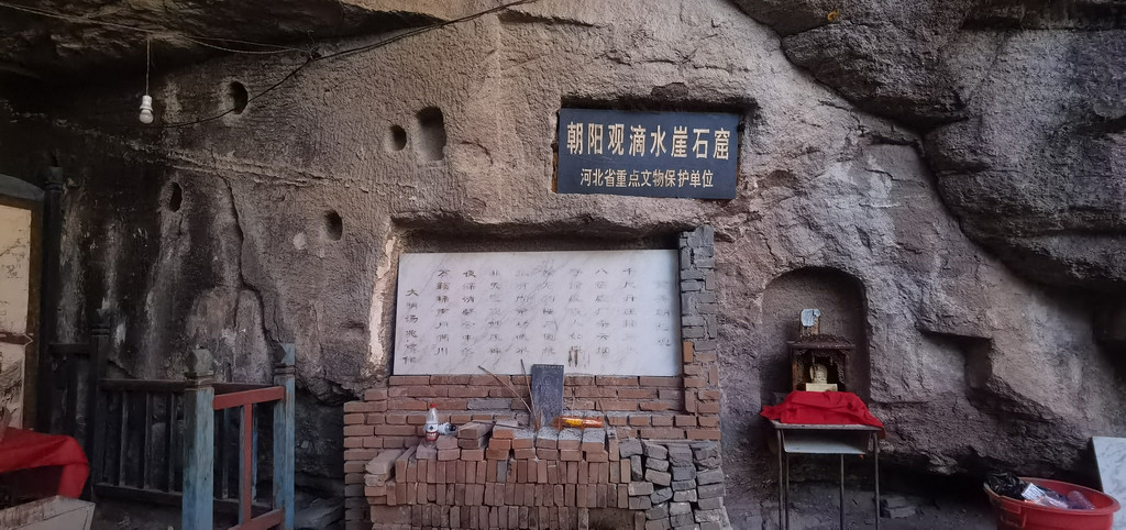 后城赤壁更适合攀登、近瞧。它如一条巨龙,龙头朝南,正对着后城镇。在南端最高的这面峭壁上,古人于净高度40-50米一线开凿的石窟朝阳观、千佛洞,如同龙头上的两只眼睛,一左一右。有山路修至峭壁跟前,有凿石而成的阶梯通向隐藏在半壁的石窟。古人信仰的力量将巨石也部分地征服了。西边的朝阳观,有洞窟七八个,其中一个名为滴水洞,洞内石缝里长年滴水,寒冬不冻,滴水崖即因此得名。这些洞窟中有许多石雕佛像,是明嘉靖三十年宣府官员吴钦主持历经五年开凿而成。明朝徐渭游历至此,曾作诗赞道:“朝阳道观一石悬,滴水孤崖百丈边。余气出关连大漠,长风吹壁立青天。窗扉近在栖雕处,阁道都栏坐客前。不信夜来高顶望,定应笙鹤下瑶山