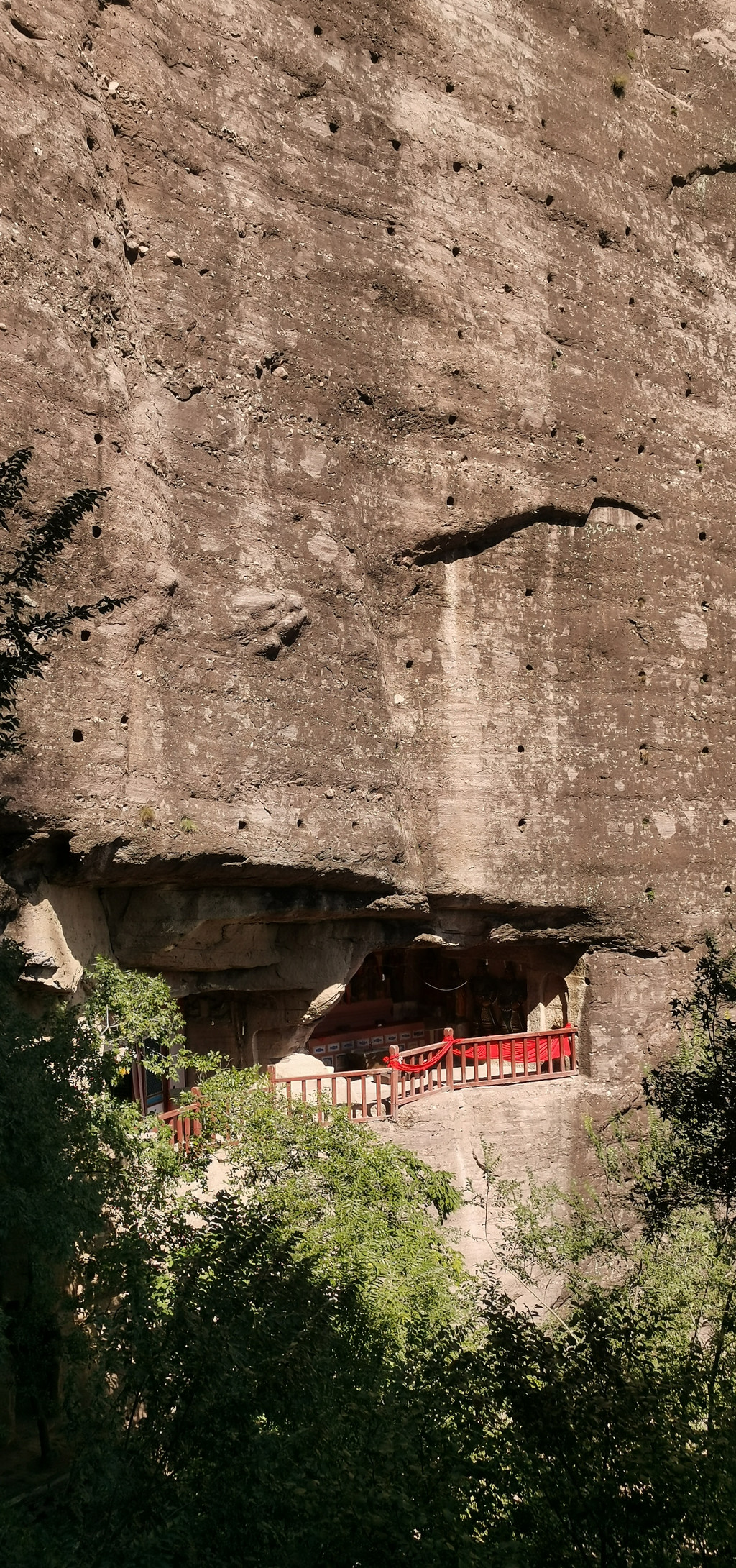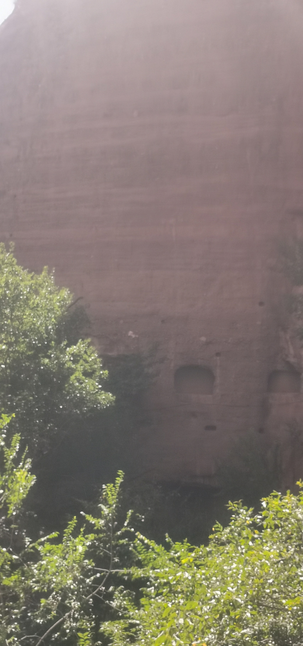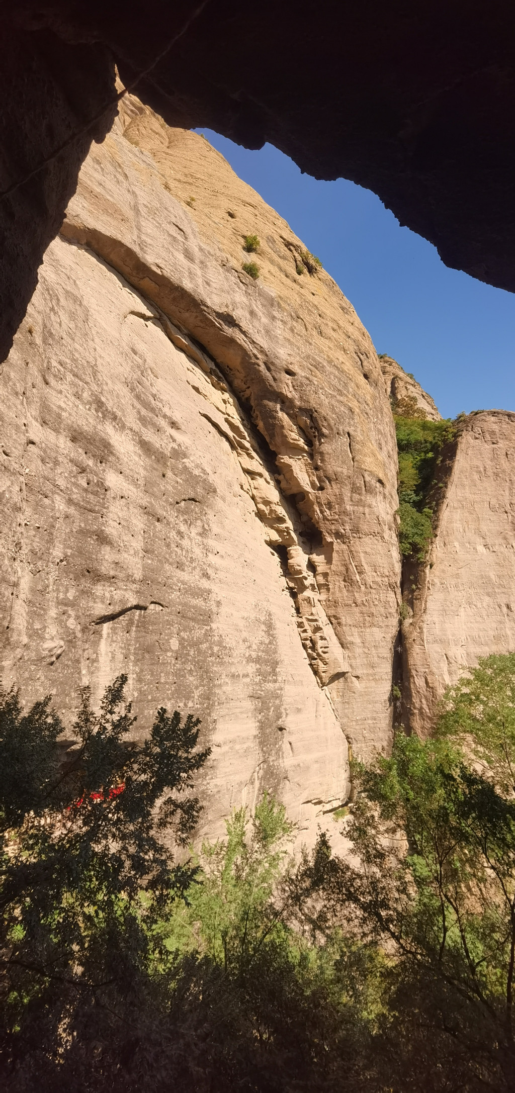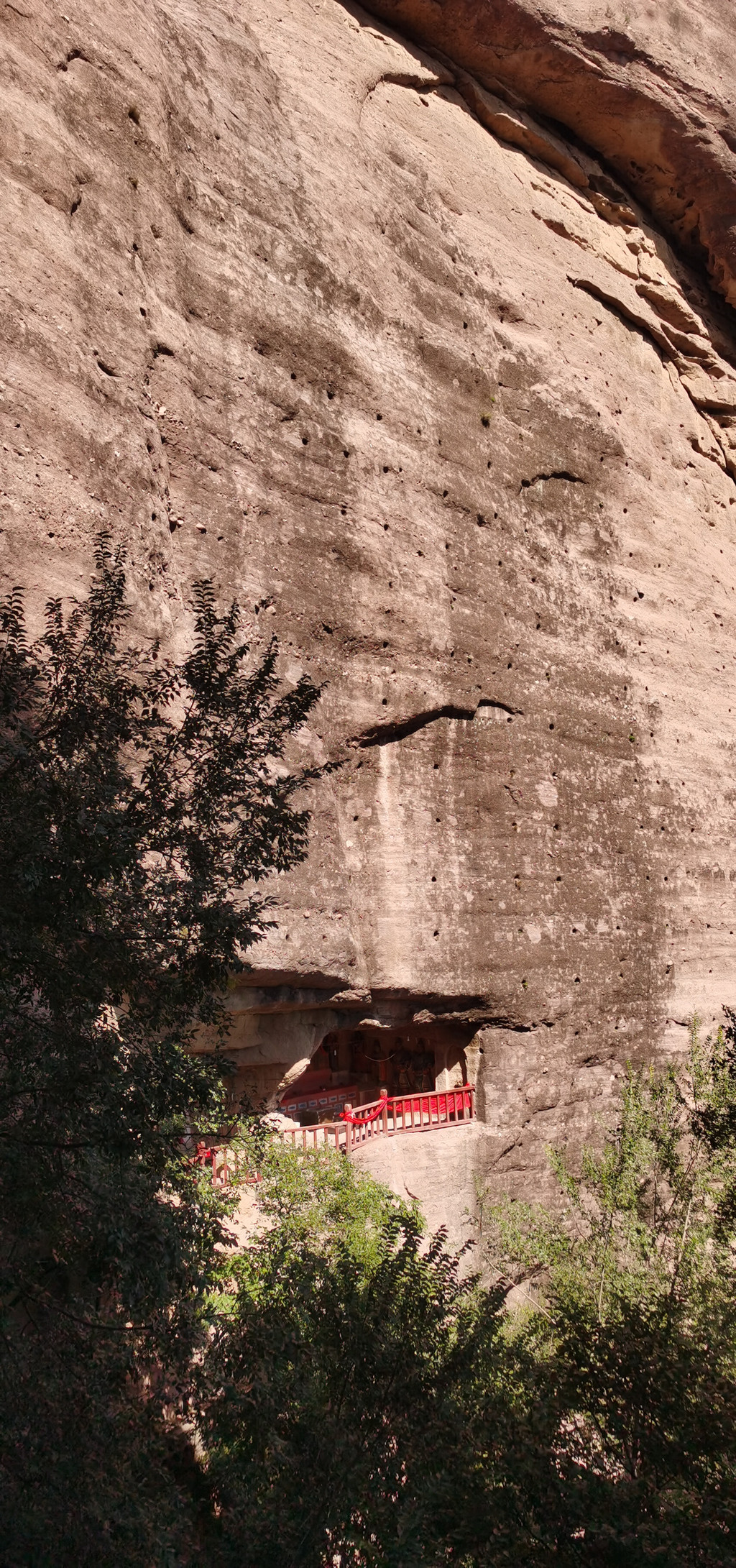 后城赤壁更适合攀登、近瞧。它如一条巨龙,龙头朝南,正对着后城镇。在南端最高的这面峭壁上,古人于净高度40-50米一线开凿的石窟朝阳观、千佛洞,如同龙头上的两只眼睛,一左一右。有山路修至峭壁跟前,有凿石而成的阶梯通向隐藏在半壁的石窟。古人信仰的力量将巨石也部分地征服了。西边的朝阳观,有洞窟七八个,其中一个名为滴水洞,洞内石缝里长年滴水,寒冬不冻,滴水崖即因此得名。这些洞窟中有许多石雕佛像,是明嘉靖三十年宣府官员吴钦主持历经五年开凿而成。明朝徐渭游历至此,曾作诗赞道:“朝阳道观一石悬,滴水孤崖百丈边。余气出关连大漠,长风吹壁立青天。窗扉近在栖雕处,阁道都栏坐客前。不信夜来高顶望,定应笙鹤下瑶山