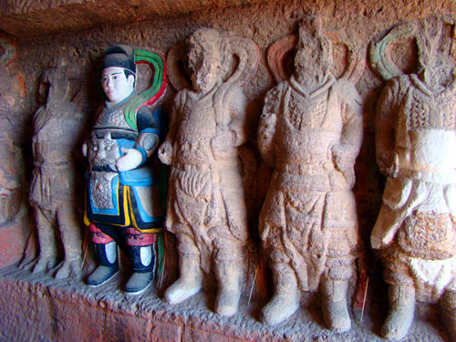 正中雕三世佛,两侧和前面立四大弟子,石壁上整齐地排列着1008尊高浮雕小佛,神态各异,令人目不暇接。地上有两个天然坑穴,用石头击打,一个咚咚像鼓声,一个当当似钟鸣,故称作地鼓、地钟。