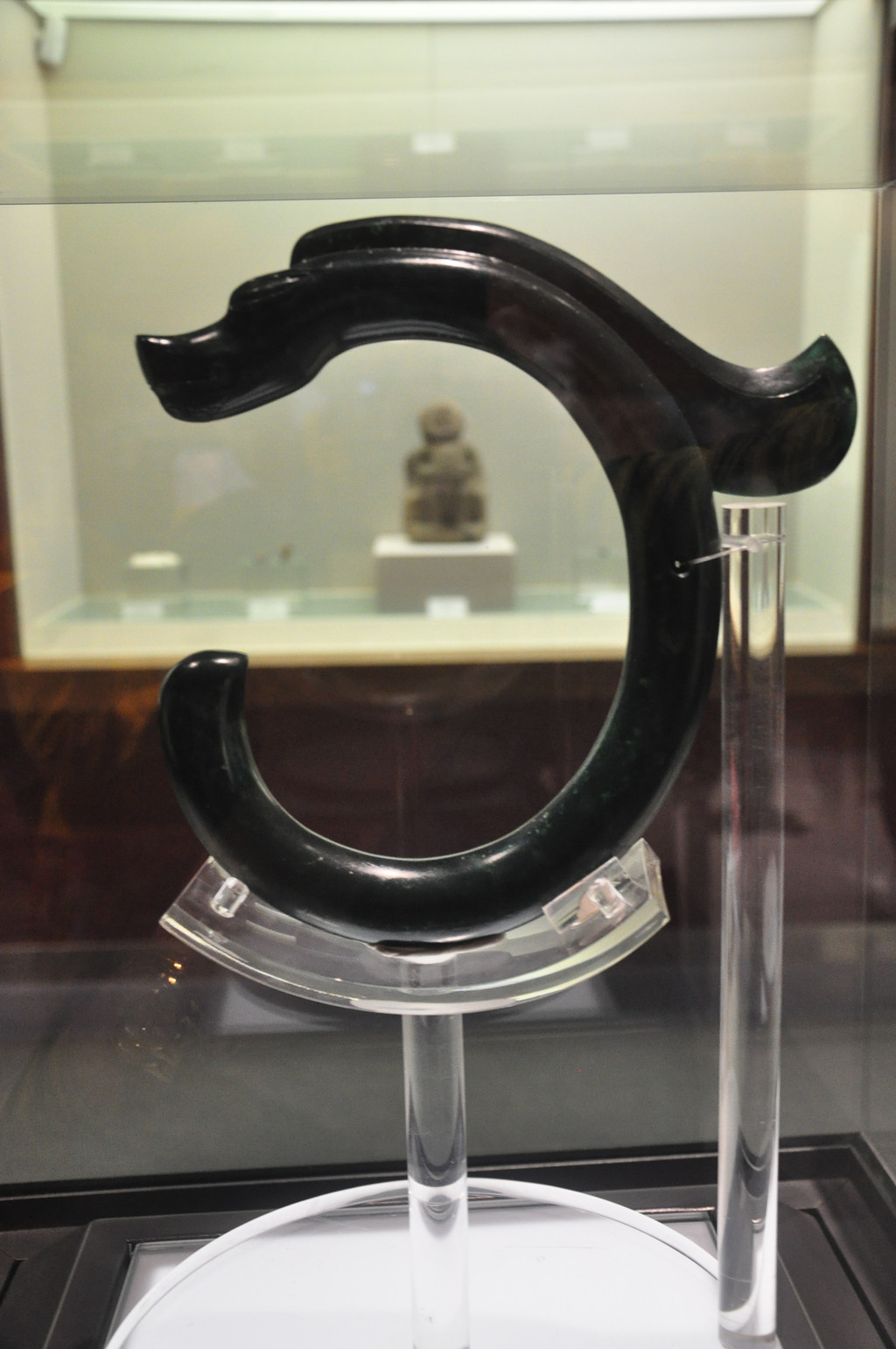 红山文化是与中原仰韶文化同时期、分布在西辽河流域的发达文明,在发展中同中原仰韶文化和北方草原文化相交汇产生的多元文化,是富有生机和创造力的优秀文化,其内涵十分丰富,手工业达到很高水平,形成了极具特色的陶器装饰艺术和高度发展的制玉工艺。红山文化的彩陶多为泥质,以红陶黑彩常见,花纹十分丰富,造型生动朴实。玉器制作为磨制加工而成,表面光滑,晶莹明亮,极具神韵,发展中具备了专业化、系统化、规范化,到目前为止,红山文化的玉器已出土近百件之多,其中出土自内蒙古赤峰红山的大型碧玉C型龙,周身卷曲,吻部高昂,毛发飘举,极富动感,是红山文化玉器的代表作,被誉为"天下第一龙"。因赤峰境内多有龙表玉器出土,故赤峰被称为龙的故乡,红山文化的先民应为龙的传人。