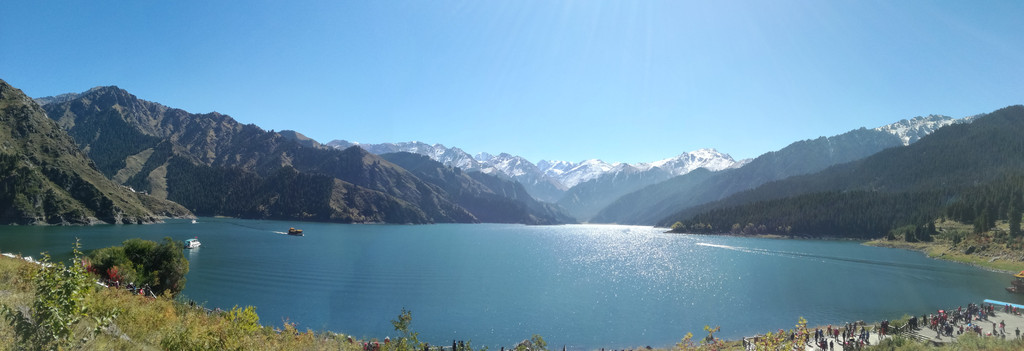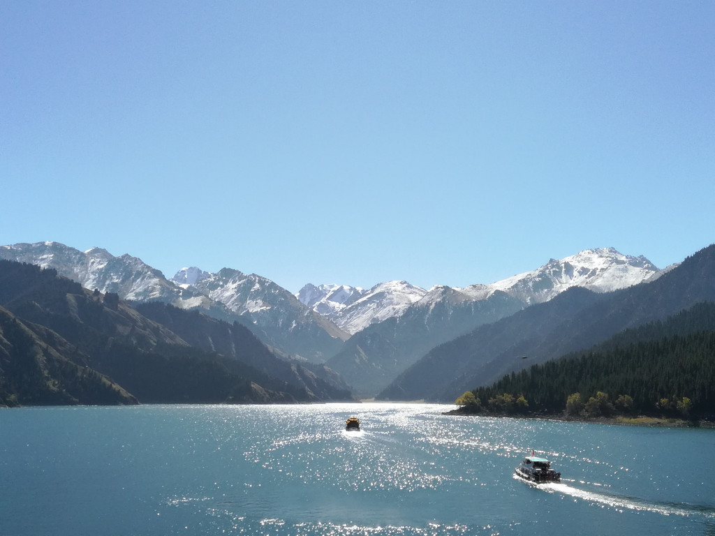 之前听网上戏说,天山天池和长白山天池,都是“不来后悔,来了也后悔的地方”。我们去过长白山天池,感觉它的景色就很壮观迷人,至今印象颇深,今天,我们对天山天池还是充满期待。交通车到达天池,下车的景色就明摆着,蓝天白云之下,绵绵的雪山,湛蓝的湖泊、青翠的松柏,明媚的阳光、通透的光影。“早知”瑶池“美,何须下西湖”,此说一点不为过。凡世间的事,大都是“耳听为虚,眼见为实”。