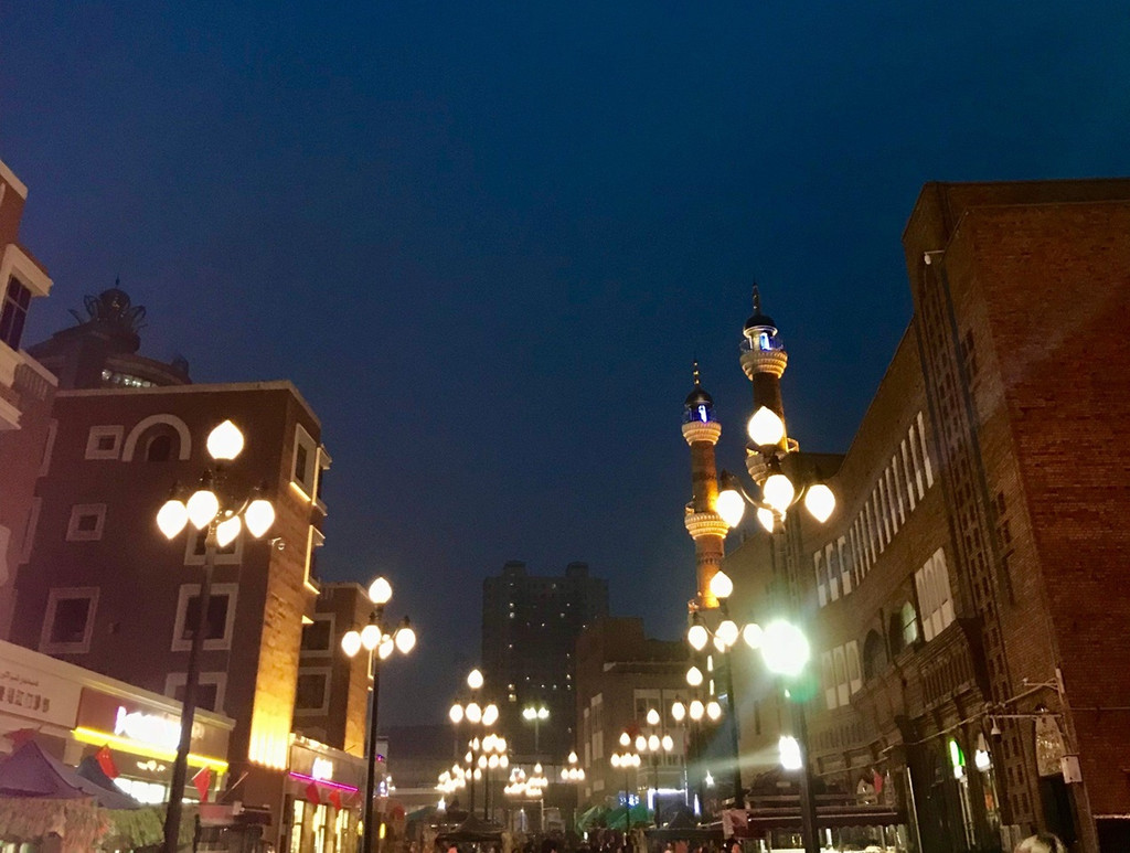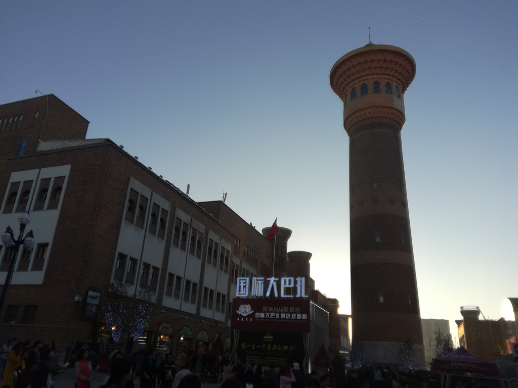 从红山公园出来,我们在公园东门乘公交61路,1元/人,行程约40分钟,傍晚时分来到二道桥国际大巴扎。巴扎(维语意,为贸易集市),乌市二道桥国际大巴扎于2003年落成,是目前世界规模最大的巴扎。它集伊斯兰文建筑风格、文化商贸、娱乐餐饮为一体。被称为“新疆-中亚之窗”。如今,这里已成人们来乌市旅游观光的热门地之一。市区乘坐公交10路、16路、61路、63路等到二道桥站下车就可到达这里。