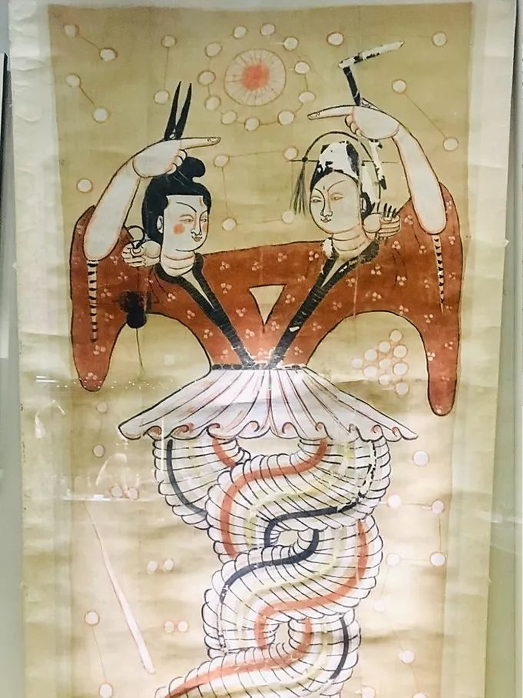 镇馆之宝,吐鲁番古高昌国阿斯塔纳墓地出土的【伏羲女娲图】。据传说,华夏始祖伏羲和女娲,分别持规和矩,在日月星辰下交尾媾合,被解读为中国版的亚当夏娃。双螺旋状的交尾方式,与人类遗传的基因密码DNA结构一致,也是神话故事与现代科学的神奇巧合。