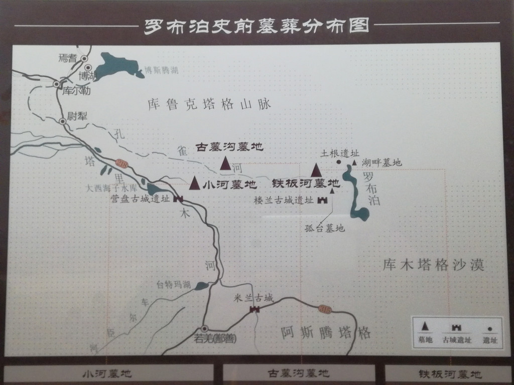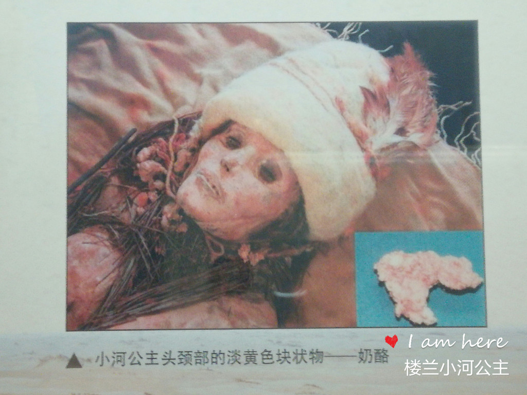 这具沉睡了近4000年的小河公主(也被称为微笑公主的木乃伊)和身边一块存放了一块3800多年的干奶酪,曾震惊了国际考古界。经权威论断:小河墓地出土的木乃伊都是混血人种,他们拥有欧洲人和东亚人的混合基因。是向西的亚洲人与向东的欧洲人通婚的结果。(小河公主的木乃伊现已移至北京珍藏)。游客在此只能看到出土时的图片。