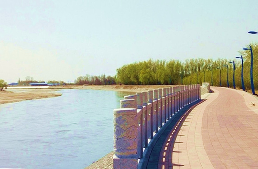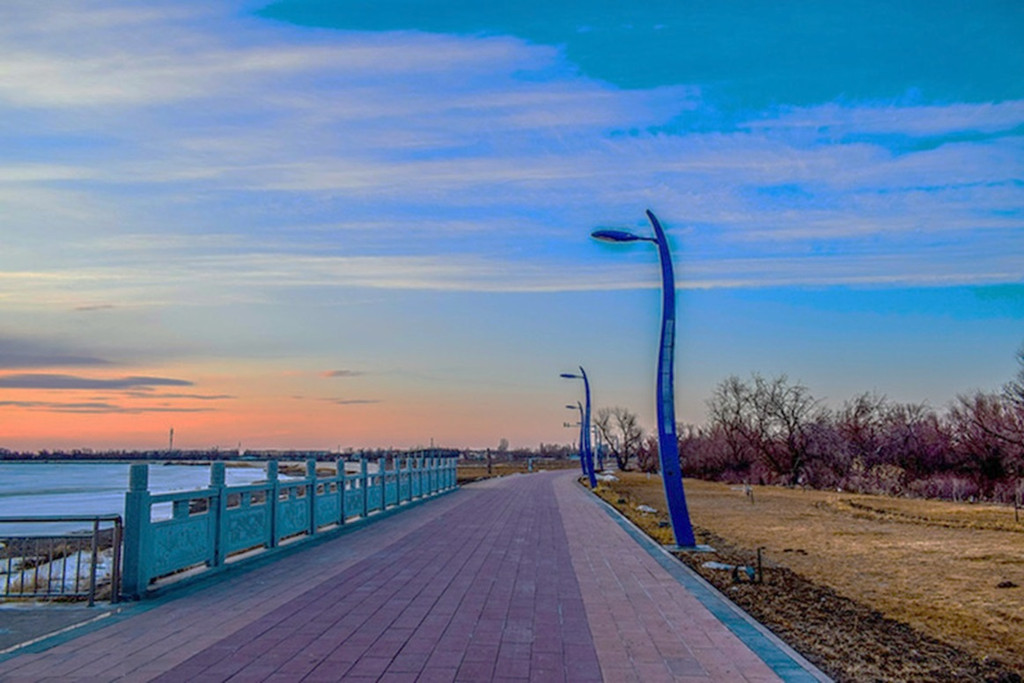 按照保安指点,我们继续向南步行约300米,来到了一座桥上,著名的北疆乌伦古河即刻呈现在眼前。沿着河堤平坦的步道,我们一路心旷神怡,一路浏览河光水色,别有一番景象。