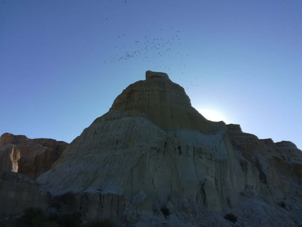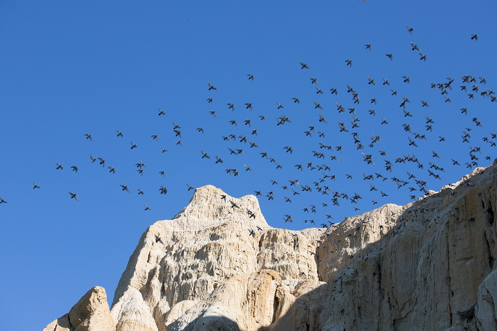 雅丹的悬崖峭壁上有着数不清的洞穴,使得这里成了鸟类栖息的天堂。鸽子、海鸥、野鸭等群起群飞,场面巍巍壮观。它们时而掠过海面,时而在上空盘旋。世世代代如此,这些飞鸟的粪便甚至改变了丹霞的颜色、也重塑了山体表面的线条。这种景象我们从未看过,也从未想过!