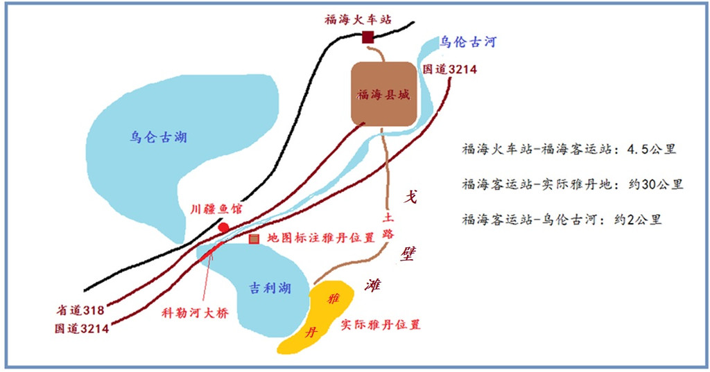 为此,我们做了不少功课,却越做越担心。原因是:从一位自驾旅友上传的手绘地图证实,百度和腾讯地图上标注的福海雅丹位置是错误的。至此,也查不到更多的相关信息。最后,总算查到地图雅丹标注地有家名叫“川疆鱼馆”的电话。抱着试试看的心态,成行之前给鱼馆打了个电话,从鱼馆老板娘的口中得知:地图标注雅丹地果然与实际雅丹地误差了十多公里(下图)。