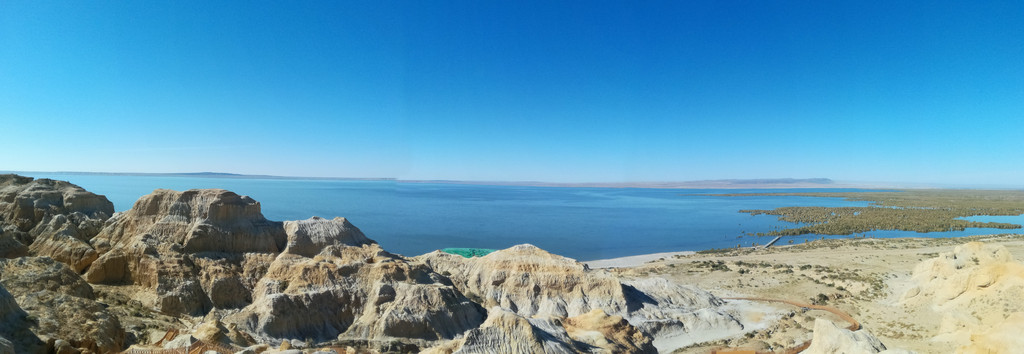 出租车沿着戈壁滩上的似路非路,一路颠颇、一路尘烟。行驶三十多公里,约40多分钟,终于走到了土路的尽头,湛蓝的湖水和奇特的雅丹地貌赫然眼前。不确定的探寻之旅,即刻变成现实,我们心中不免就有些激动。