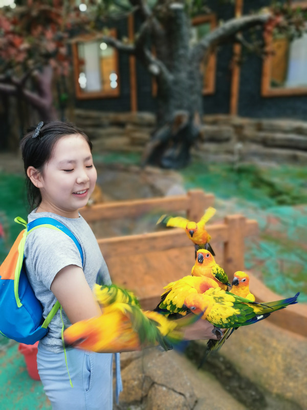 鹦鹉互动区,20元可以带一个孩子进入,鹦鹉都一怕人,一招手都飞来了,有的落在肩上,有的落在头上,很好玩。