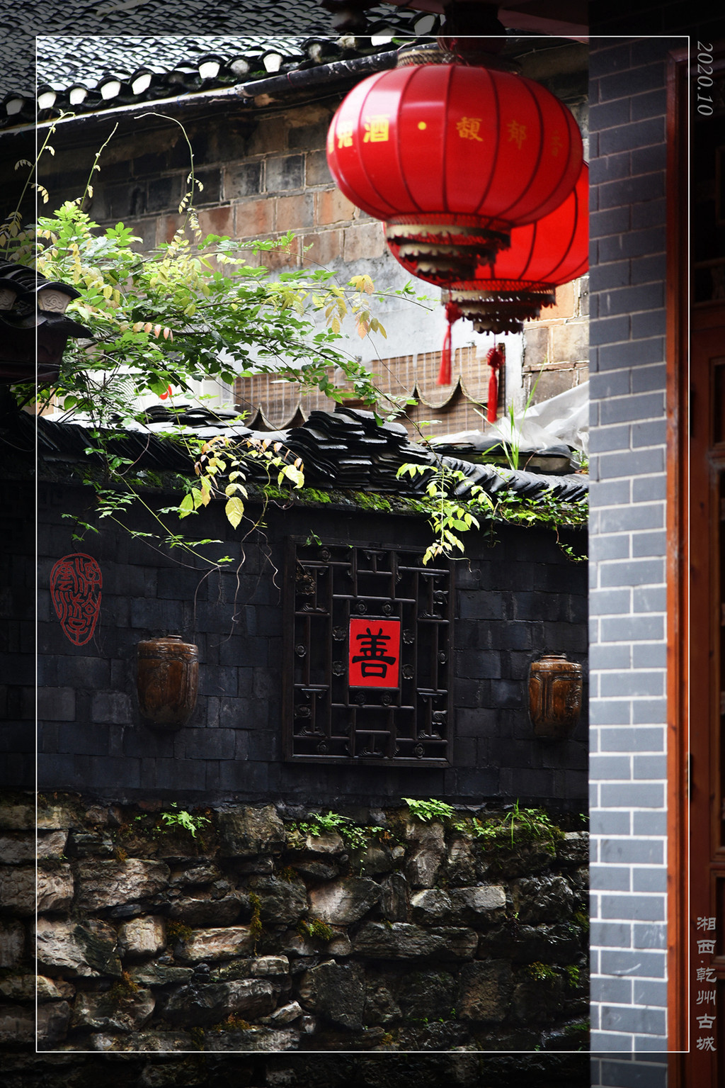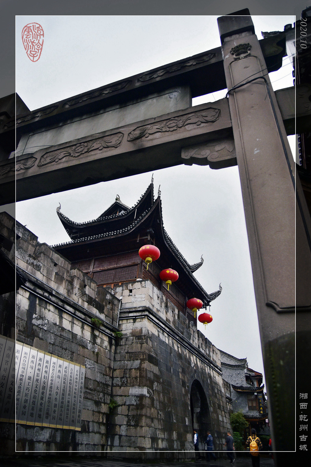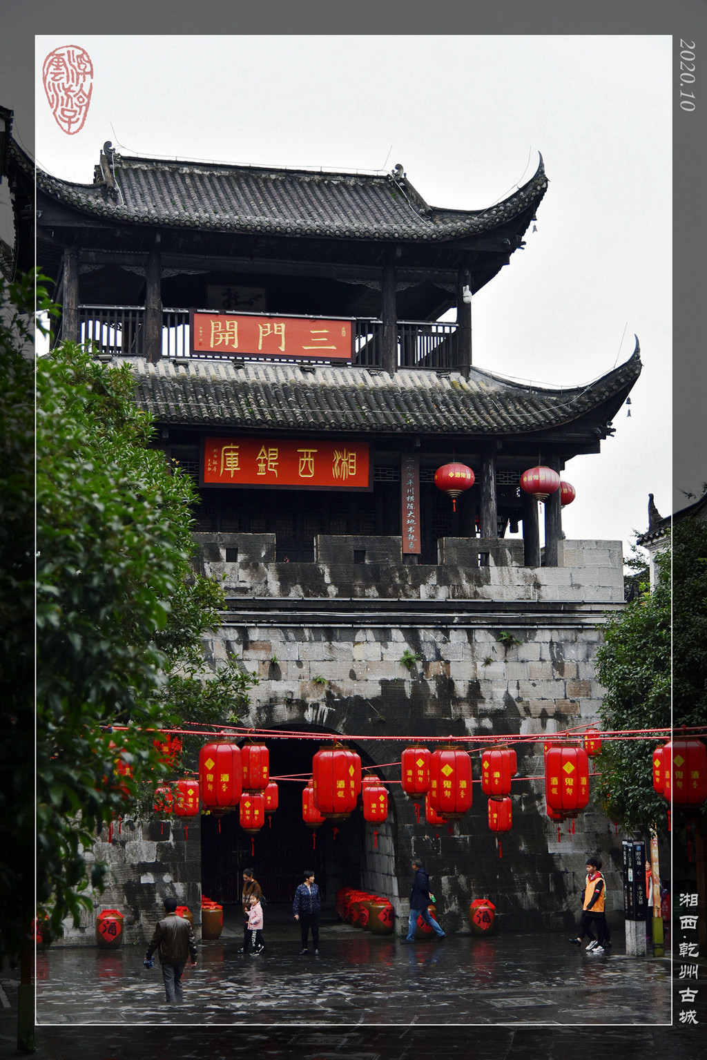 晚饭后从古城南面拱极门进入,雨后的石板街映着古老屋檐下的大红灯笼,城门后的大街两旁商铺林立,这与东部地区的古城没太大区别。再往里走,渐渐冷清,游客也稀少了,两边的老房子关门落户,窗台上屋檐下晾晒着酱菜和衣服之类,俨然是寻常人家。走不多远,一座高大的城楼,牌匾上书“三门开”,这就是乾州古城的北城楼。一般的城门门楼都是前后两道门,而这里有三座城楼三道城门,成了绝无仅有的古建筑绝品。城楼外面一条大河流过,叫做万溶江,天色已晚,夜雨微凉,沿江走了一段,穿了几条灯火幽暗的小巷,回到了住宿的酒店。