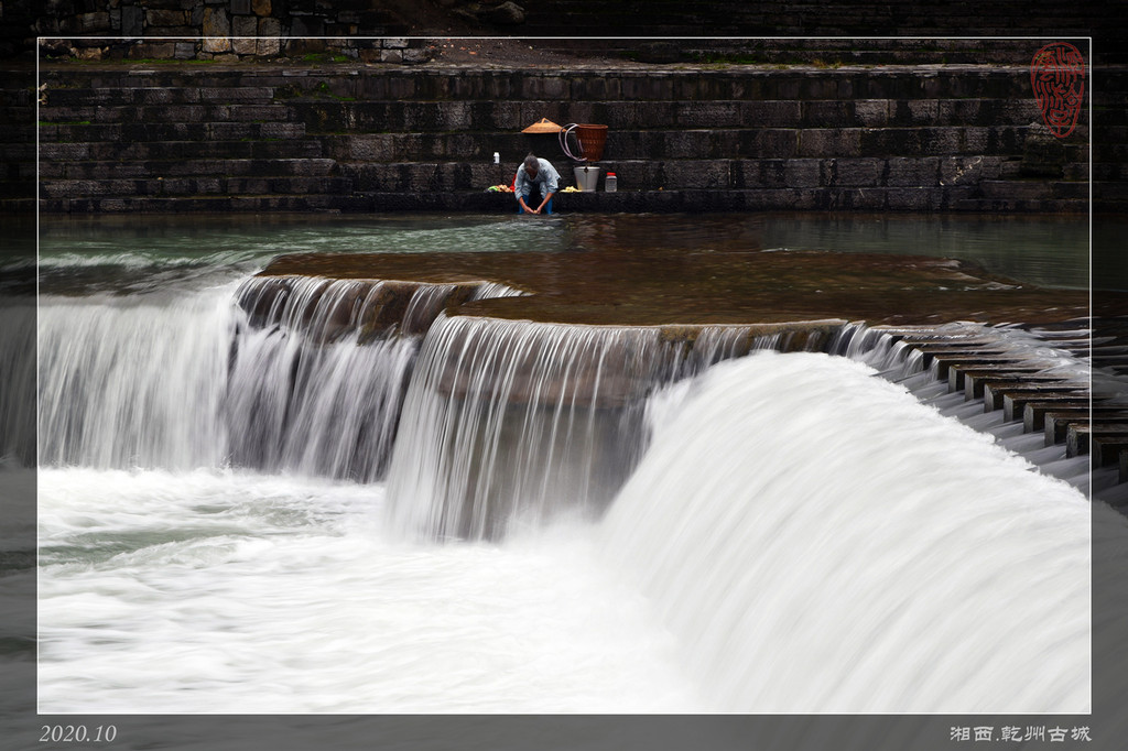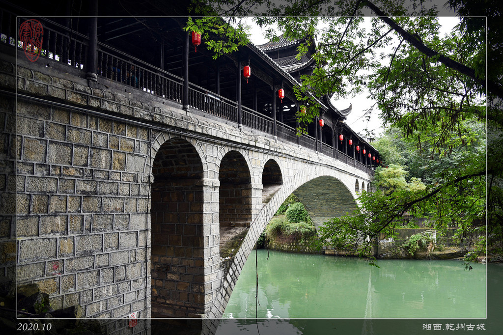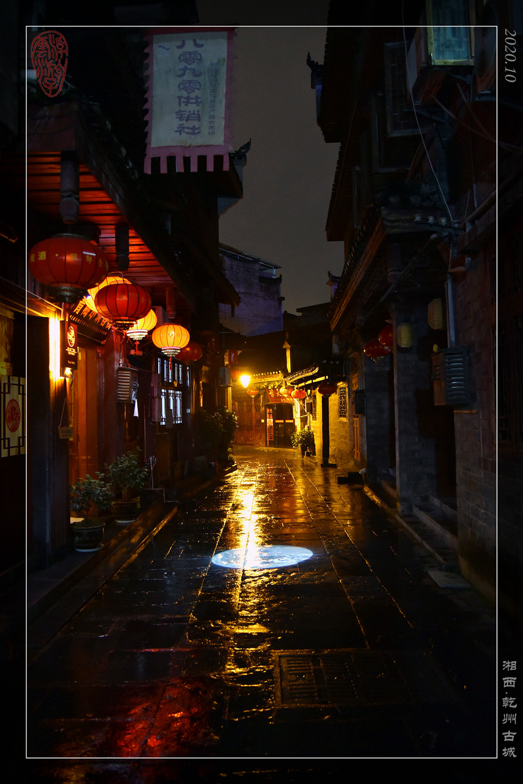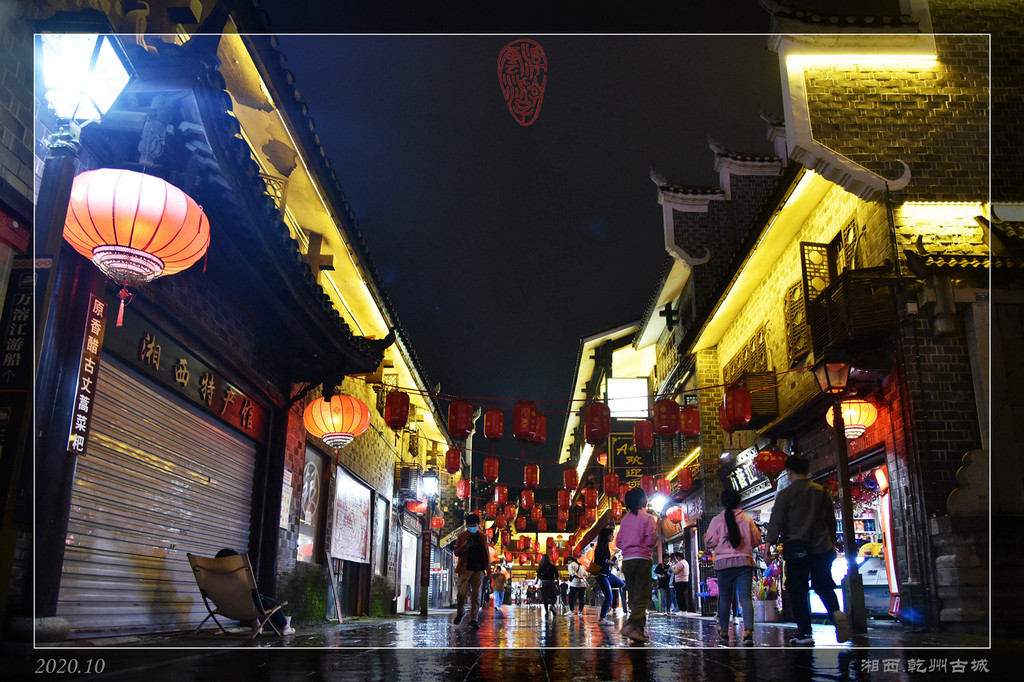 晚饭后从古城南面拱极门进入,雨后的石板街映着古老屋檐下的大红灯笼,城门后的大街两旁商铺林立,这与东部地区的古城没太大区别。再往里走,渐渐冷清,游客也稀少了,两边的老房子关门落户,窗台上屋檐下晾晒着酱菜和衣服之类,俨然是寻常人家。走不多远,一座高大的城楼,牌匾上书“三门开”,这就是乾州古城的北城楼。一般的城门门楼都是前后两道门,而这里有三座城楼三道城门,成了绝无仅有的古建筑绝品。城楼外面一条大河流过,叫做万溶江,天色已晚,夜雨微凉,沿江走了一段,穿了几条灯火幽暗的小巷,回到了住宿的酒店。