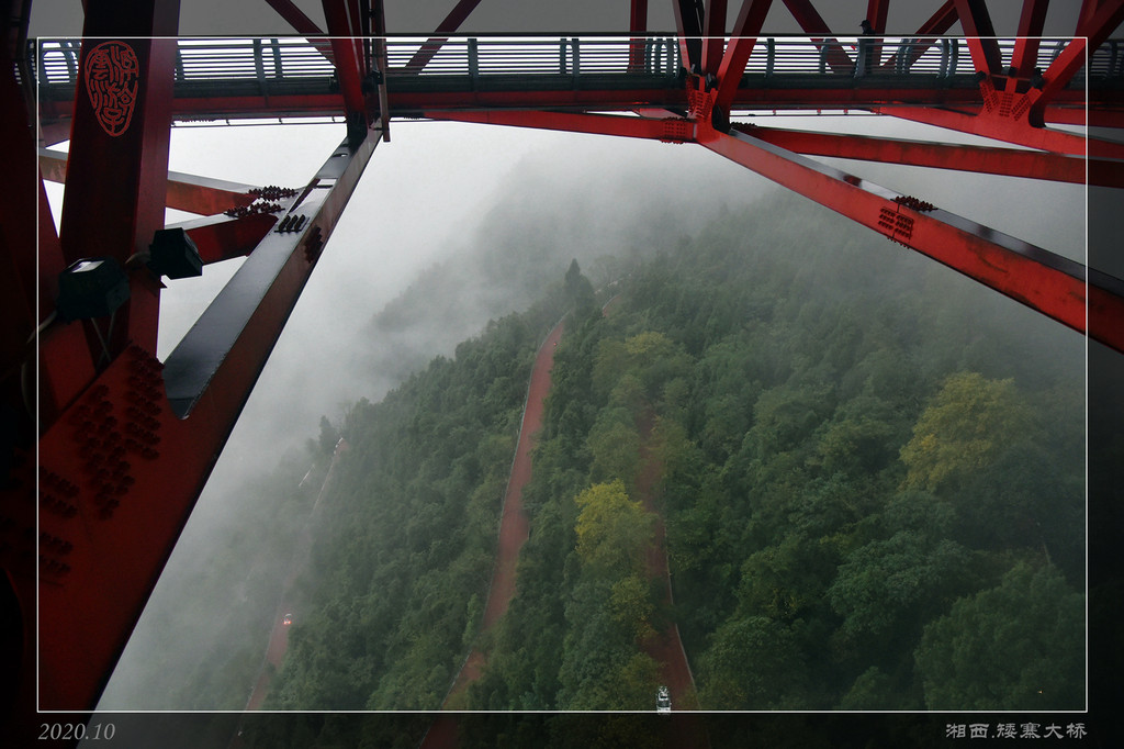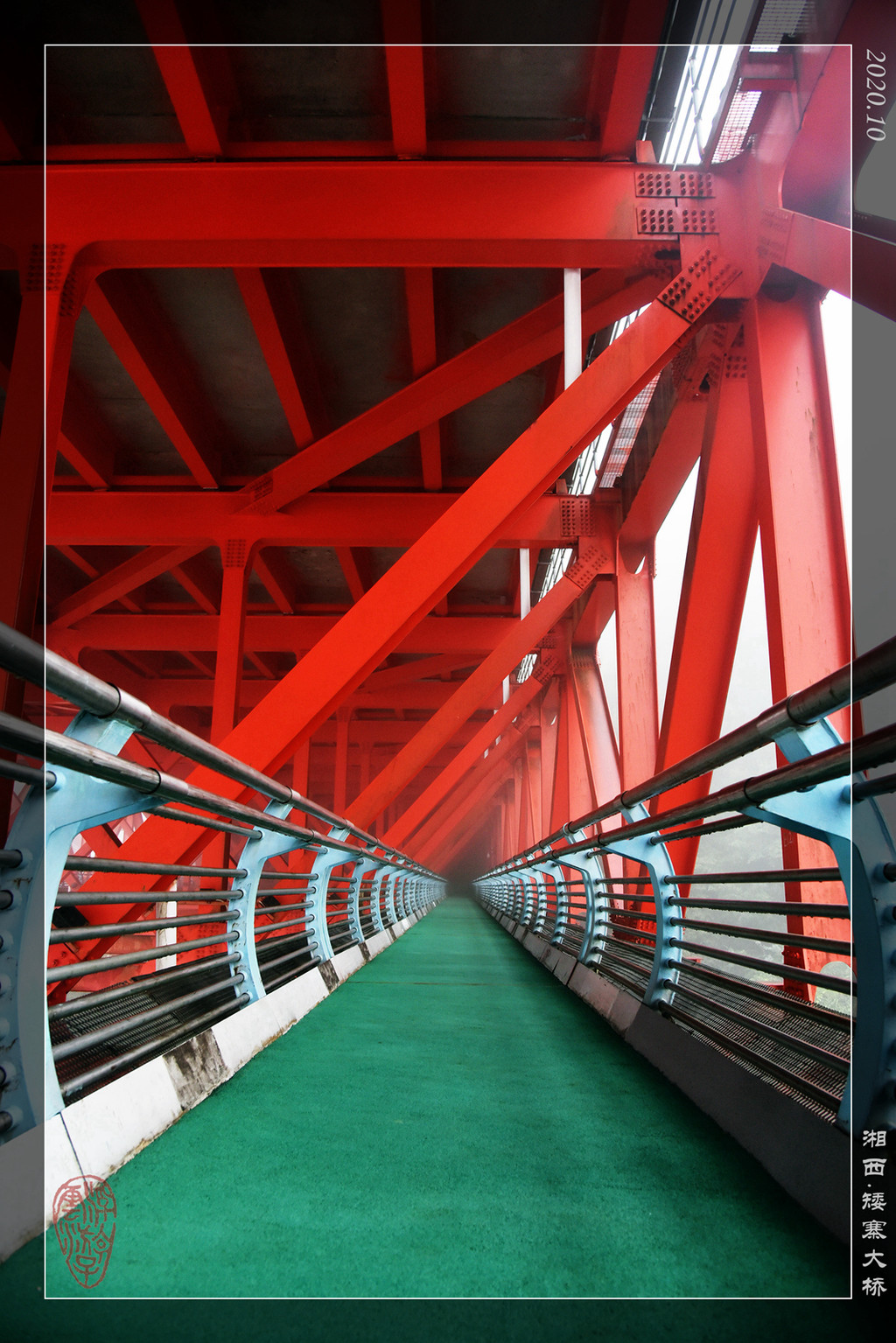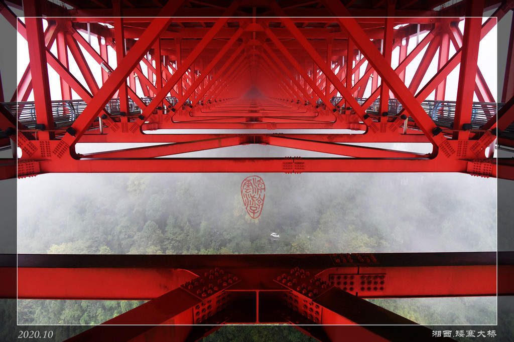 其实从问天台另一端过去,可以直接到矮寨大桥的景区入口,可是我们的车在苗寨入口处,开车却要绕过十几里曲曲折折的山路,翻山越岭才能到达,此时云雾越来越浓,天色也暗了,我们进入景区,矮寨大桥巨大的桥墩就在身边,也需费力的睁大眼睛才能隐约看到。不过这景区并不是远观大桥全貌,而是深入大桥腹地近距离的感受大桥建设环境的艰险和壮观。桥面之下有行人通道,随大桥横跨峡谷,走在空中,可以看到桥下的农田村镇,以及刚才经过的盘山公路,只是这些一半靠云雾暂歇的朦胧显现,一半靠自己的想象了。矮寨大桥有四个世界第一,但都是工程建设的技术应用,岳父是学土木的,因此对这里特别推崇,而大多数人看过这些第一,也记不住,且难有感触。走在桥下,身临其境,看着鲜红的钢结构材料纵横交接,组成整齐又错落的线条,想起刚才从桥上开车经过时天外飞仙般的吊索,不得不感叹这矮寨大桥的雄奇和壮丽!