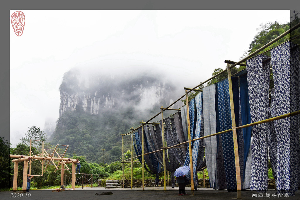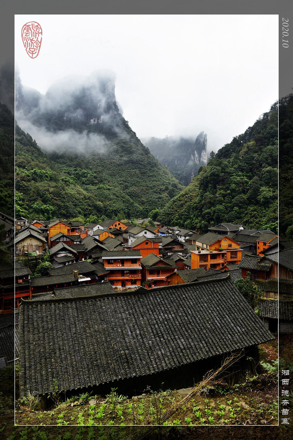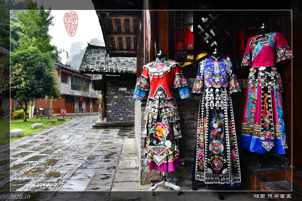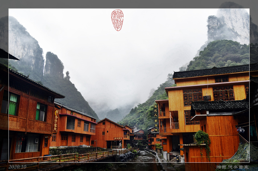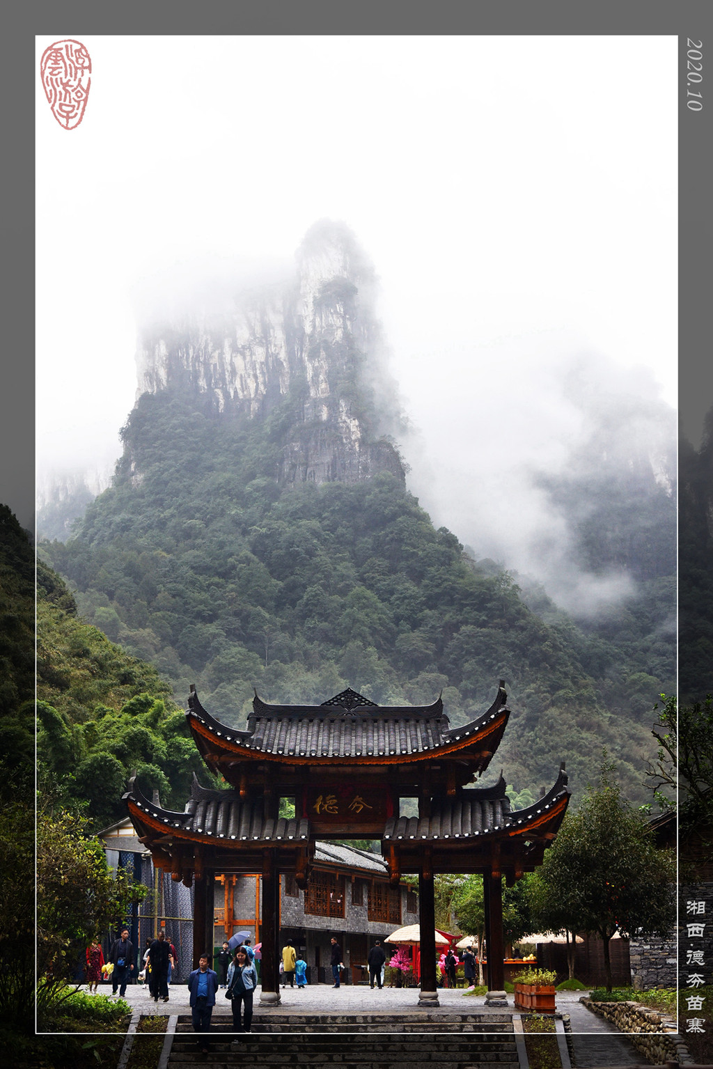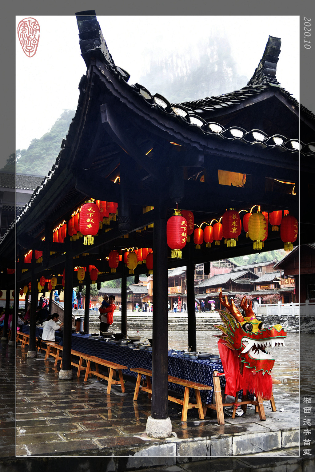 盘山路走到底,就在山谷里穿行,这里山形壁立,和张家界的群峰相似,是武陵山区的典型地貌,此时这些峭立的山峰也都插入云中,不见其顶。不多远就到了德夯苗寨的寨门口,本以为大山深处的苗寨应该是破旧原始的,但明显这里的旅游已经开发的很成熟了。门口有所谓的农文化体验区,新修的木屋内摆放些水车石碾犁耙之类,还有宽阔的游客广场,长假期间特意摆起了长龙宴,让游客体验苗家在节日欢庆的特殊宴席方式。但此时不是饭点,尚未开席,我也看不到吃的是些什么东西。苗寨的房子大多数很新,刷了油亮的桐油,间或有几栋破旧的吊脚楼,在不起眼的角落和大山的高处,随着道路的畅通和旅游的普及,这些大山深处的苗民也都过的不错了。