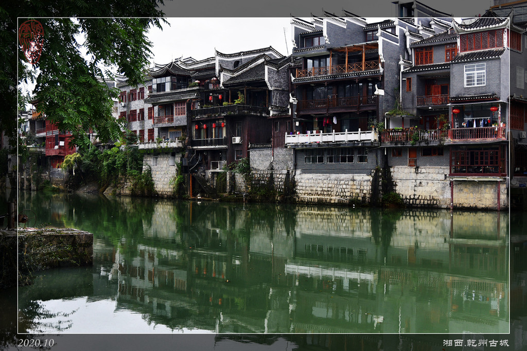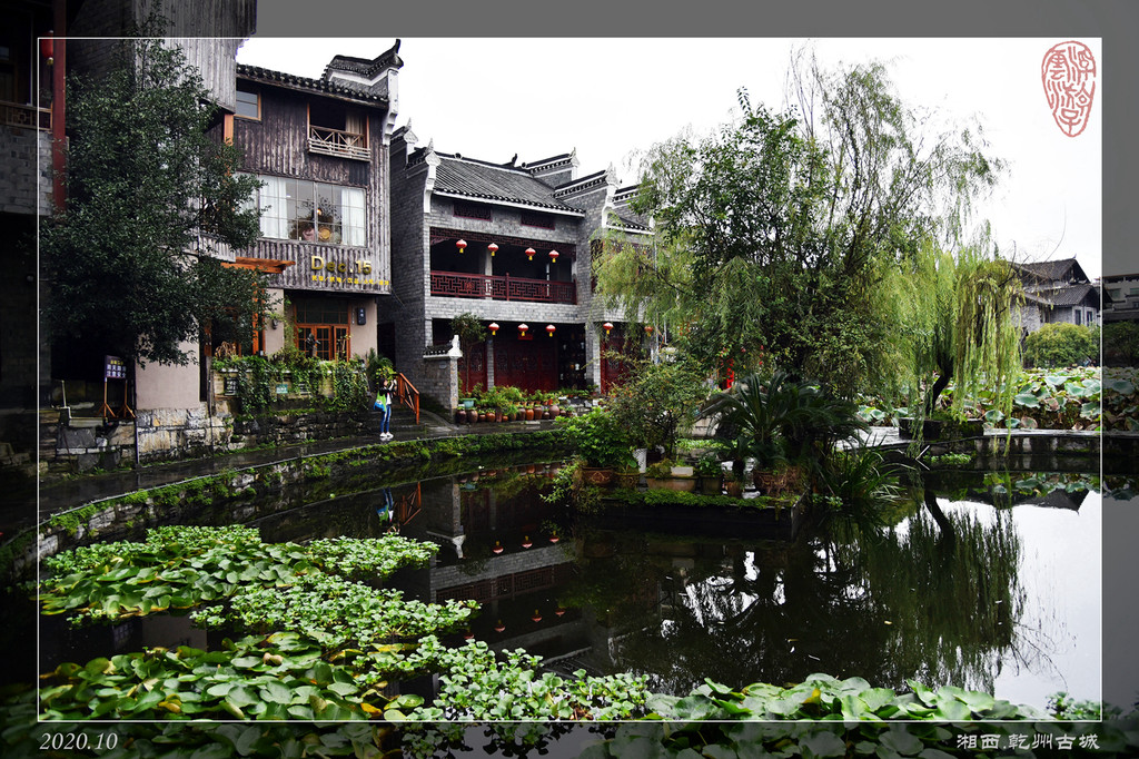 10月3号一早从古城西北角的入口进入,景区安排了一位讲解,跟着她依次走过文庙、罗荣光故居、杨岳斌故居……、胡家塘等景点,听着一路介绍,终于对这座古城有了大概的了解。乾州自秦汉起就是周边区域的商埠码头,经济发达,明清时期成为苗疆的军事文化中心,人才辈出,尤以武将出名,如赴台抗法的陕甘总督杨岳斌、抗击八国联军保卫大沽口殉国的天津总兵罗荣光等,文庙曾是抗战沦陷期国立八中旧址,朱镕基夫人劳安女士在此就学。现在古城内仍以当地居民为主,过着寻常日子,只有不到百分之五的外来人员在此经商,难怪昨晚闲逛时,大多数房子都黑灯瞎火。印象最深的是古城东南的胡家塘,布局与皖南宏村的月沼相似,但是水塘面积更大,且开满野荷,此时荷花已凋谢,只剩下高大的残荷布满池塘,高过人头。池塘周围是青砖黑瓦的民房,斑驳的墙面映衬着枯败的荷叶,一起记录着古城的历史。